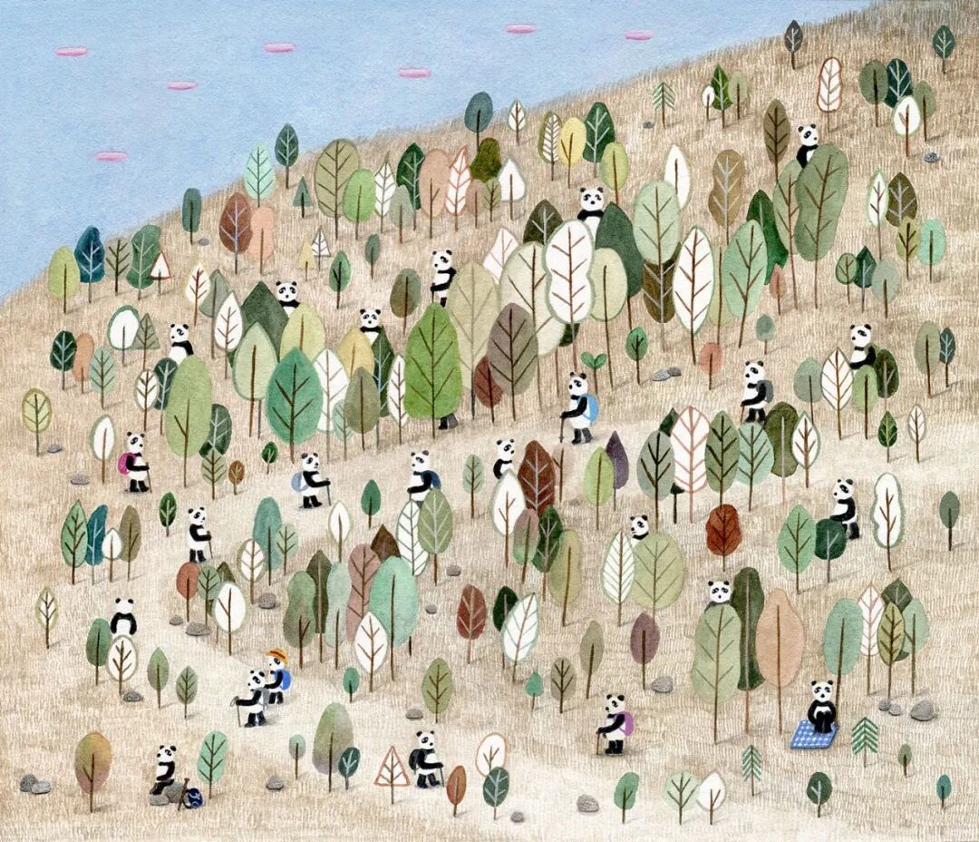韩裔美籍的插画师Paige Jiyoung Moon 用类似儿童画透视风格的作品来记录自己生活的方方面面,画风采用了单面投影图(轴测图)的构图法,这种构图法并不能反映真实看到的事物,却能够更多地展示空间、场景。