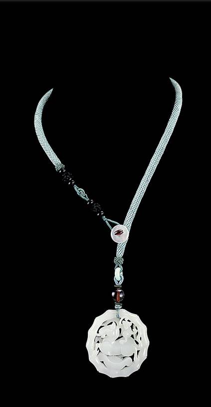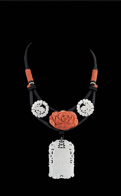 白玉镂雕一鹭莲升珮珊瑚花项饰