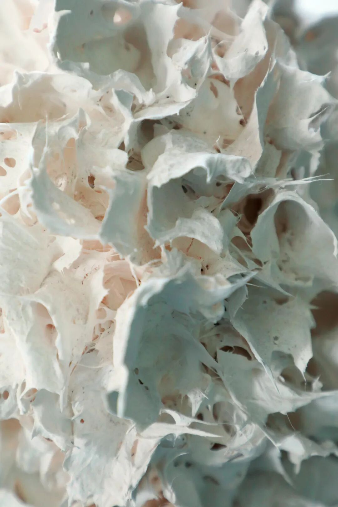 虽然作品整体为白色,但由无釉烧制的白瓷色感和施釉透明釉后烧制的白瓷色感,共由两种色调的白色构成。以一种色感具有统一感,但内部却有细微的差异,在视觉上产生了变化,利用了即使是同样的泥土,根据釉的施釉与否和烧制温度、方法的不同,泥土的色感也会发生变化的性质。无釉烧制的白瓷的白色,像早晨的雾一样温暖清淡,像纸一样轻盈,相反施釉透明釉,烧制的白瓷的白色给人更加鲜明坚硬的感觉。将这两种白色混合起来,整体上把能消除内心不安的自然隐喻为白色,同时隐约地展现了里面的生命活力的流动。