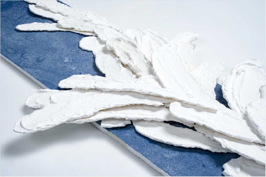 因为在我的创作中,陶瓷绘画不仅占据了很大的范围,而且在作品《白色森林》中,利用泥土制成的笔墨形成了一个绘画性的画面等,作品处处都渗透着绘画和陶瓷的创作要素。《白色森林》作品从表面的大自然形象出发,经过思考和反思的过程,试图展现在人类内心情感上起到稳定通道的作用的森林的形象,认为在大自然中可以看到无数的造型语言。其中“线的重叠”最能体现自然的生命力,因此将其设定为主要造型元素,作品是制作和在画布上涂上颜料时看到的笔触一样形态的瓷片后,用那个“陶瓷笔触”填满大画面来表现森林,这时“陶瓷笔触”用白土制成的黏土纸一个一个地制作出来,画面整体上呈白色。