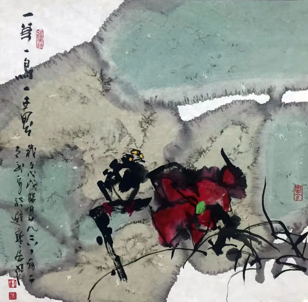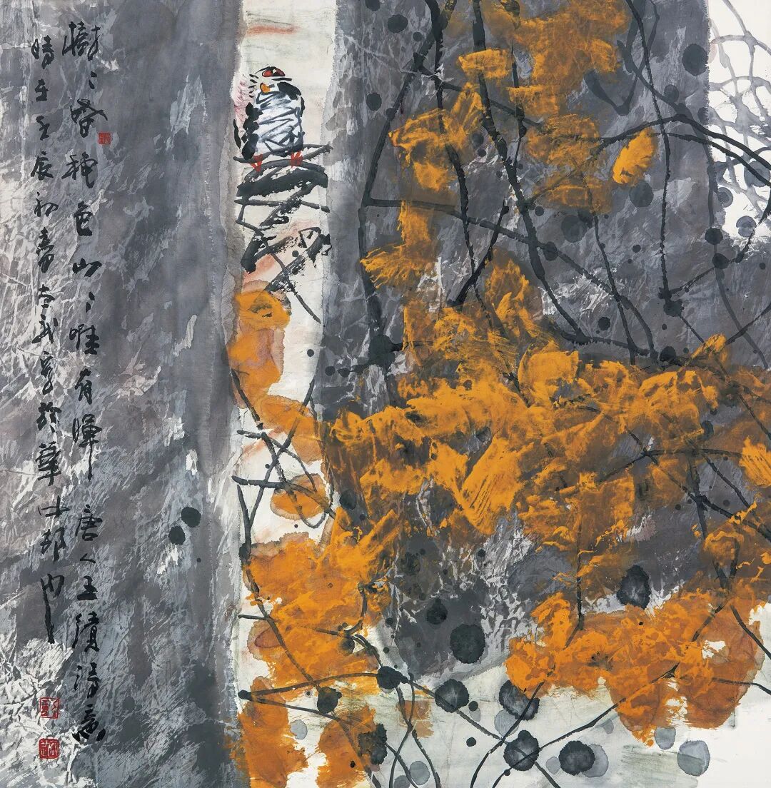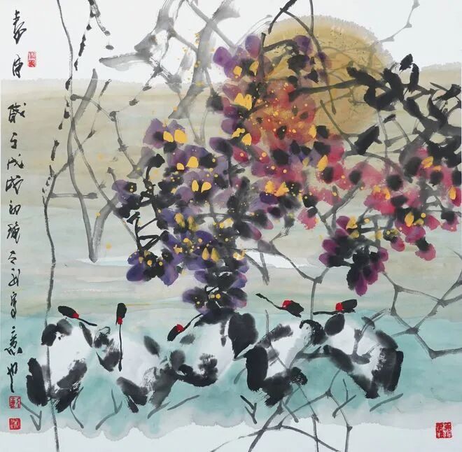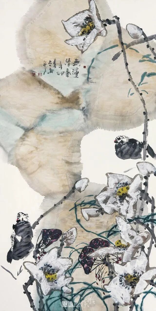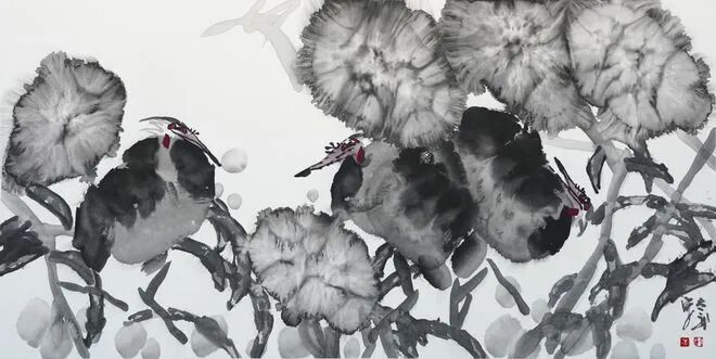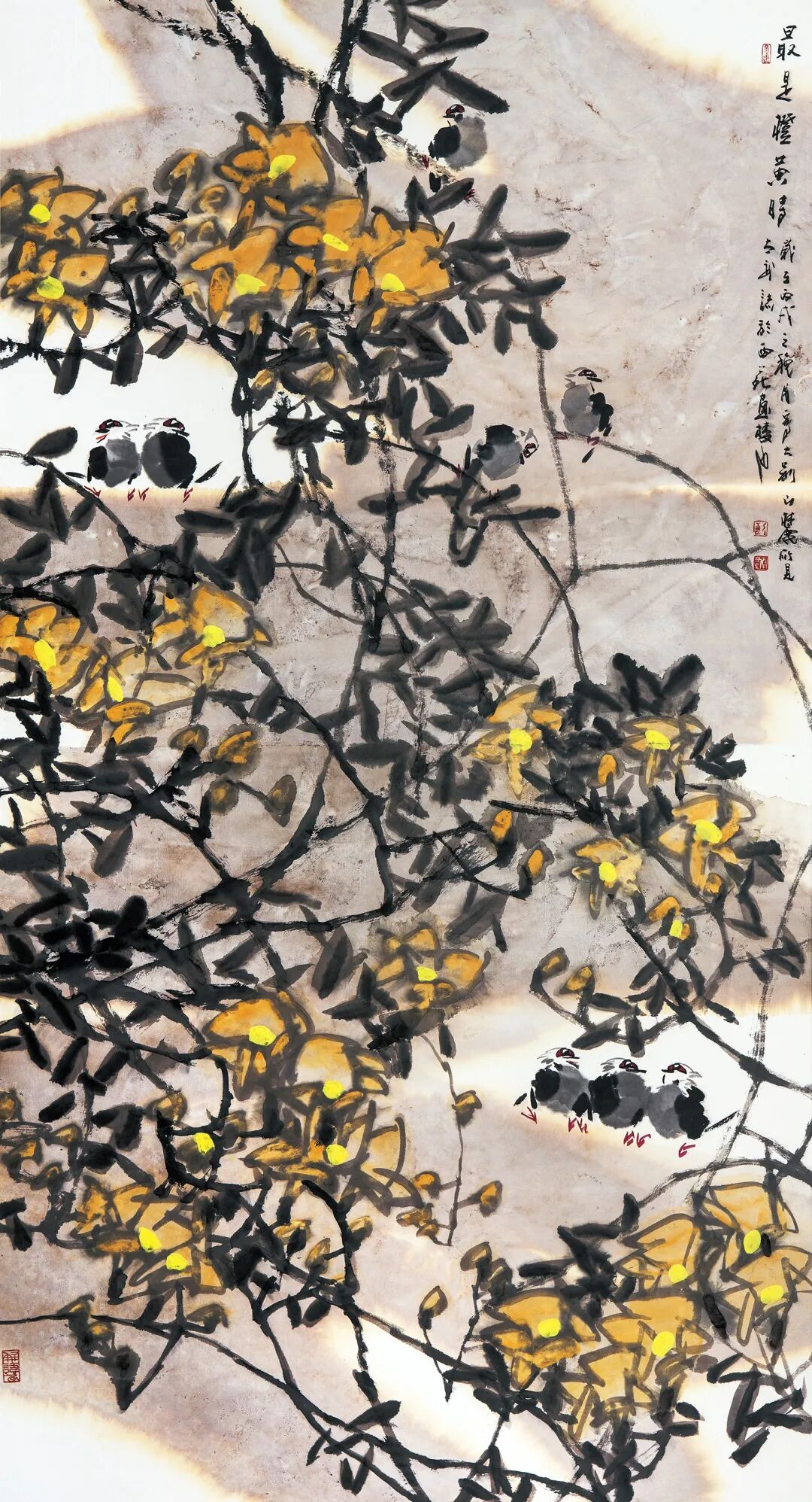 彭太武在花鸟画中所表现的时代精神,不是对时尚和摩登的追随,不是表面形式的花样翻新,而是在传统文化基础上有深度思考的创造。他坚信体现中华民族文化精神的写意中国画,有广阔的包容度,不会拒绝新元素的融入,而能随着时代的变革而产生自身的变化。