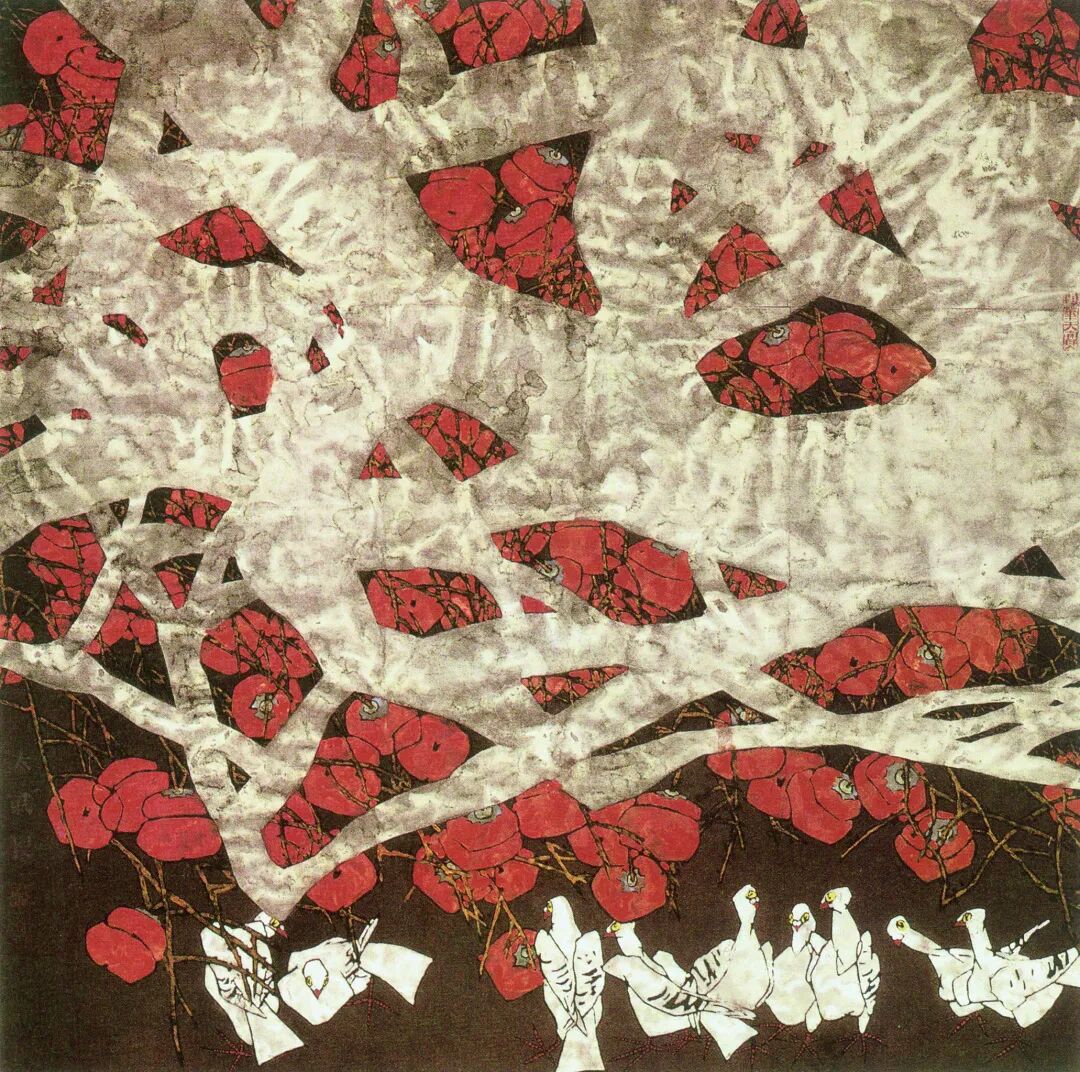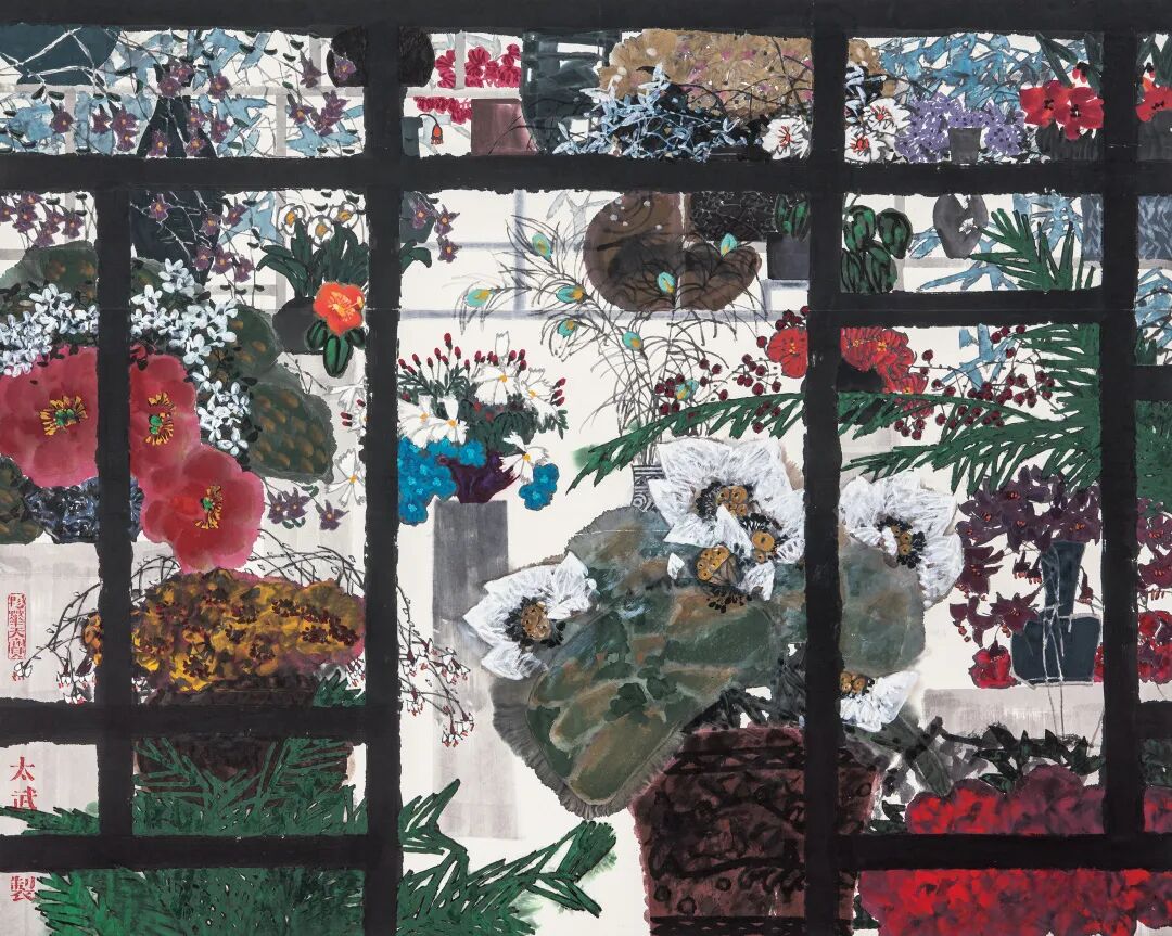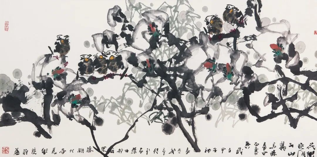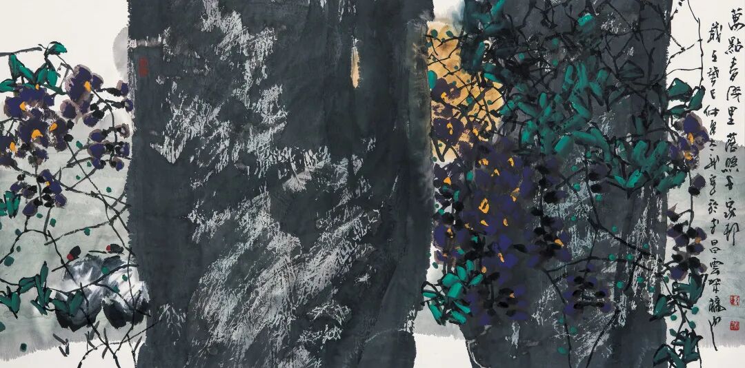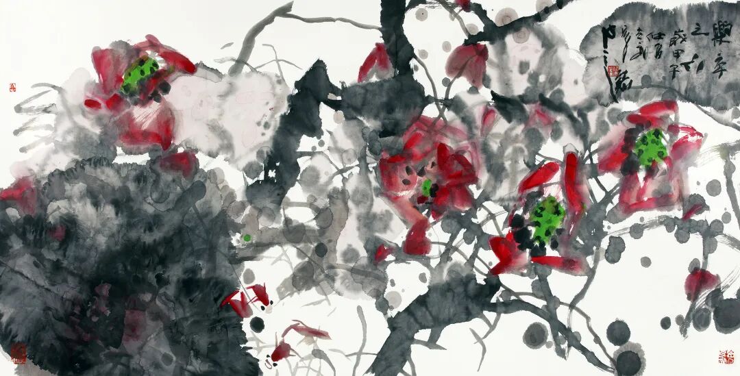 彭太武在花鸟画中所表现的时代精神,不是对时尚和摩登的追随,不是表面形式的花样翻新,而是在传统文化基础上有深度思考的创造。他坚信体现中华民族文化精神的写意中国画,有广阔的包容度,不会拒绝新元素的融入,而能随着时代的变革而产生自身的变化。