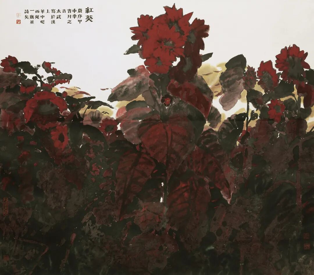 彭太武的大写意花鸟画得传统写意之精粹,有稳固的根基,同时又敏感于天地时势之变化,从古今中外文化和艺术中吸收营养,使作品放出奇异的色彩。他把构成法融入笔墨语言中,有时用满构图处理画面的空间,有时以彩代墨强化色彩的作用,有时用超越特定时空的构图等等,都是他对传统写意法的补充。
