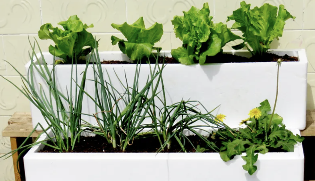 因为物业三令五申不能在公共绿地上种菜,有些居民想法子,在楼顶用泡沫大盒拼成小菜园。