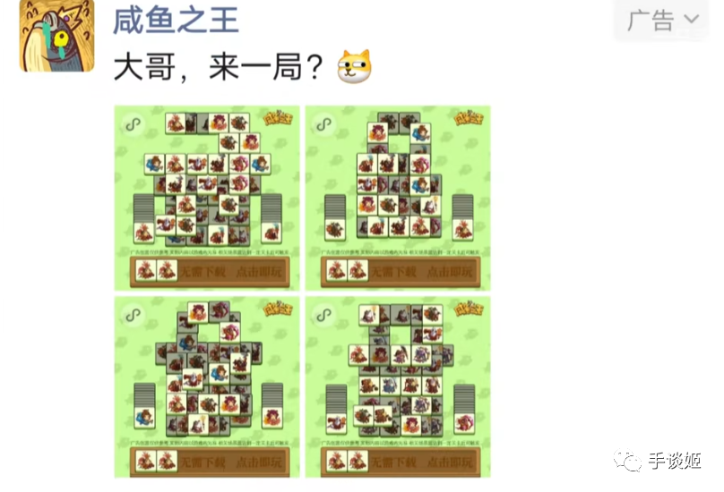 又到了每周欢乐的鉴定游戏广告时间,这款名为咸鱼之王的游戏多次出现在手谈姬的朋友圈,持续数月之久,不知道姬友们刷到过没。