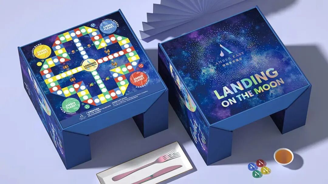 广州琥珀东方酒店的跳“月”星球礼盒外盒可以搭建成小茶几,和家人朋友来一把畅快桌游。