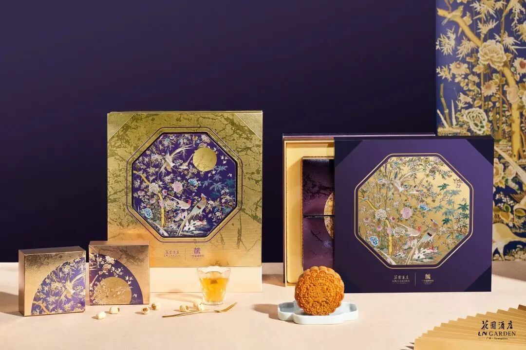 广州花园酒店携手广东省博物馆,以广东省博物馆经典藏品“石青缎地‘宝生昌’号广绣花鸟大挂帐”中纹样为主元素对月饼礼盒进行设计,既传承了广绣文化,又承载了酒店对月圆团聚吉祥平安的美好祝福。