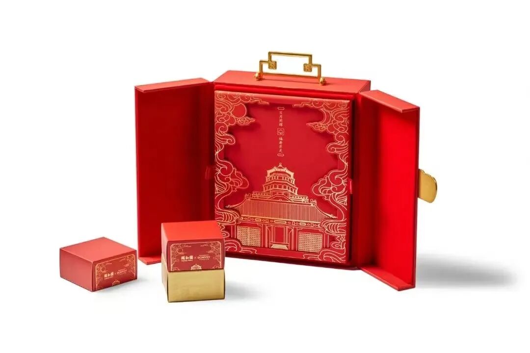 万豪酒店集团与颐和园联名款·颂月,盒身以中国红为主,意味着平安、吉祥、喜庆、福禄、康寿等美好祝愿;礼盒以颐和园万寿山建筑群为灵感,采用了“蝠式匾”、“如意云头”等象征福寿的传统元素,结合日月同辉的天文现象,营造出一种盛世空前的福寿场景。