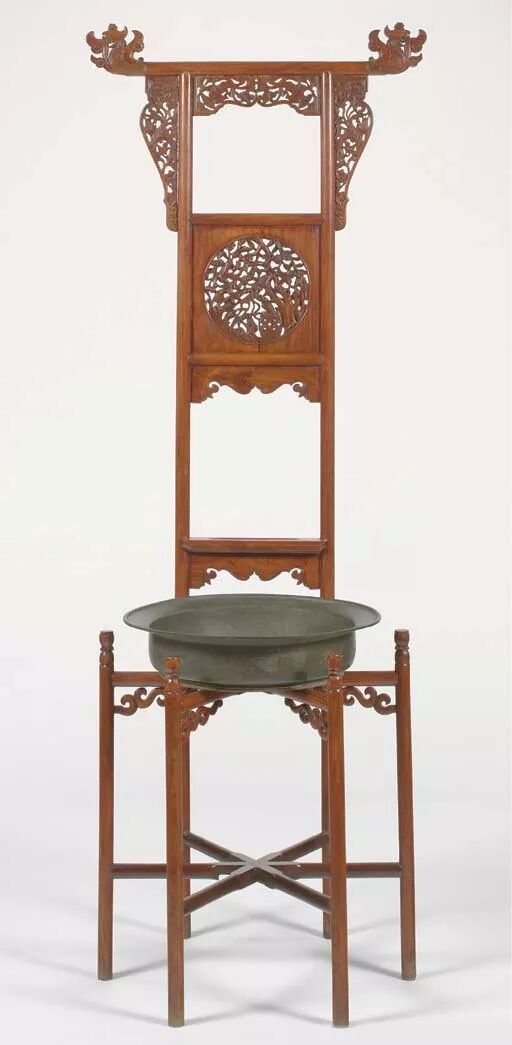 这种盆架多用六腿,而且都用直形。在前部四柱的顶端,雕出圆珠或坐狮等装饰,更增加了器物的艺术性。