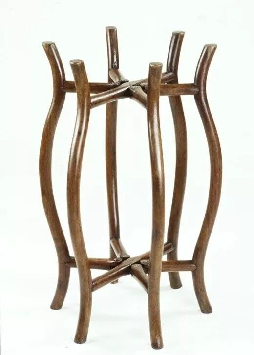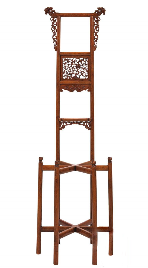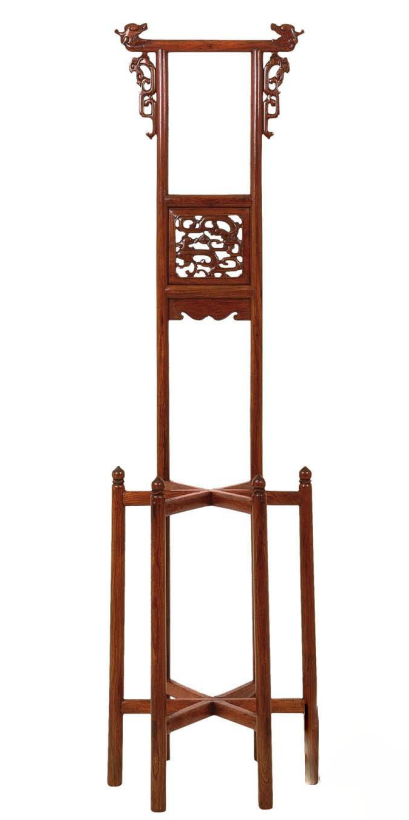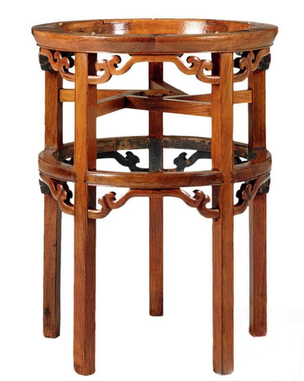 盆架,即多足且面心可以承托盆类容器的架子。多为圆形和六角形,圆形五足,六角六足。做法是在面心正中挖一圆洞,用以坐盆。腿足用蓬牙三弯腿,有的在腿间加枨子。