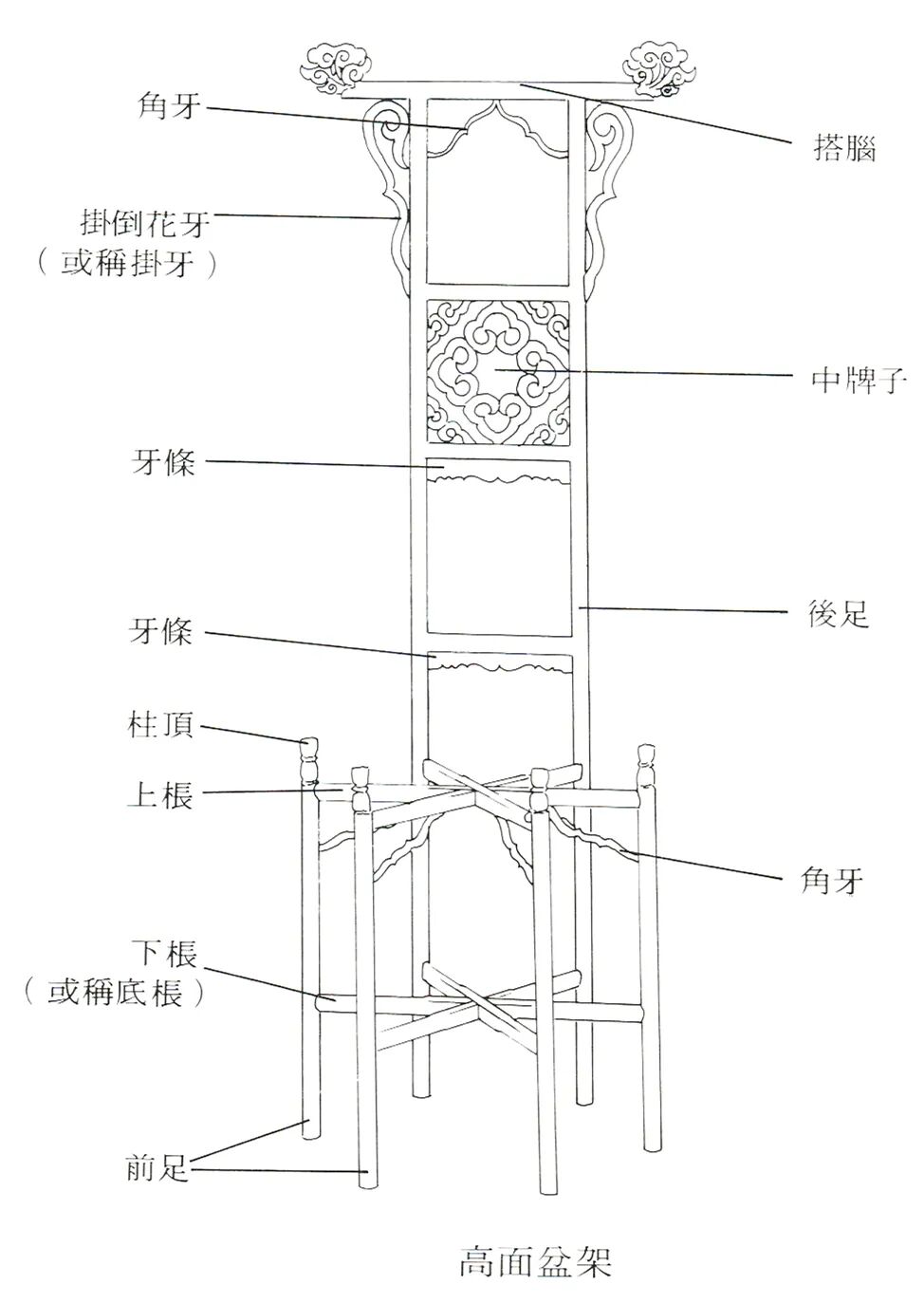 高面盆架的前四足和矮面盆架的足相似,只后两足向上伸展,加设腰枨、中牌子、搭脑和挂牙等构件。搭脑之下常有挂牙护持,可以在上面搭面巾。在腰枨上往往挖槽,以备置放胰子盒。