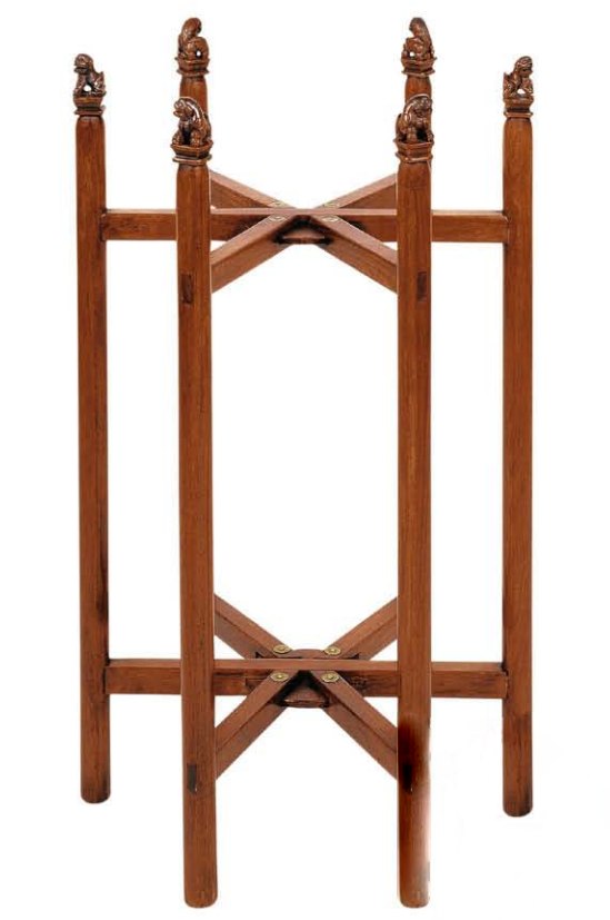 此例黄花梨六足折叠式矮面盆架,用圆材作腿足柱,顶端圆雕蹲狮,正面朝外,玲珑活泼。传世盆架柱顶一般刻莲纹,圆雕瑞兽甚罕见。六足中两足上下以横枨连接。其余四足则上下各安短材一段,一端开口打眼,用轴钉与嵌夹在上下二根横枨中间的木片穿铆在一起,以其为轴,四足因而可以折叠、便于收存。