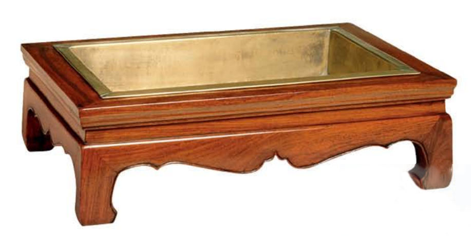 现例仿如一件小炕几,边框标准格角攒边造,有束腰,矮马蹄足,牙子锼出起线壶门式轮廊,形状优美。不同之处只是边框留空档不装板,承架铜炭盆。