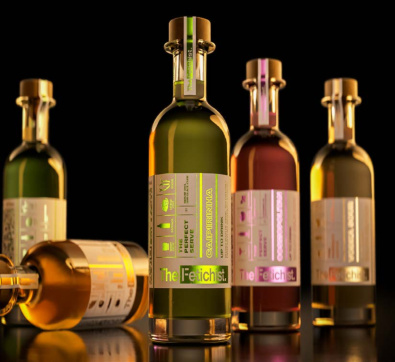 时尚鸡尾酒品牌 The Fetichist 的包装设计使用了大胆的数字霓虹灯效果,灵感来自于视频游戏和夜晚世界,而酒瓶包装上醒目的二维码则让消费者可以在扫描发现更多鸡尾酒并在线购买。