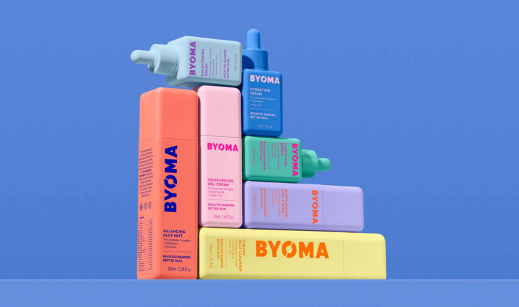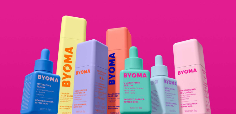 Skincare range BYOMA uses modern typography and iconography alongside bold colours to display the brand’s pioneering science, ingredients, and innovation. Made from fully recyclable, 100% monomaterial plastic, the brand’s square bottle shapes enable easy and effective shipment to reduce its carbon footprint.