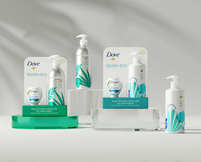 Dove 的可重复使用的沐浴露瓶和浓缩液补充剂设计也体现了同一理念, 为有生态意识的消费者提供了一个减少浪费的简单解决方案。关于如何使用补充剂和这样做的积极影响,在包装的各个部分都有清晰的说明。