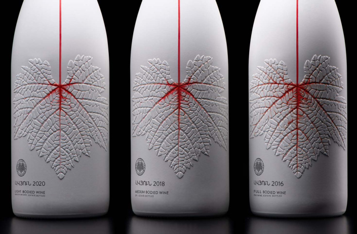 For the limited edition Avyun wine, the central element of the design is an embossed grape leaf, with red pigment ‘fowing’ through its indented veins to varying extents to refect the maturity level of the wine.