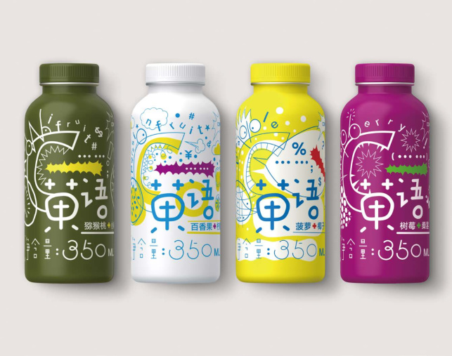 同时,菓语复合果汁的包装上是一幅有趣的 "水果怪兽 "的 插画,其中有充满活力和想象力的符号图案的涂鸦,这种创造性的方法有助于它在竞争对手中脱颖而出。