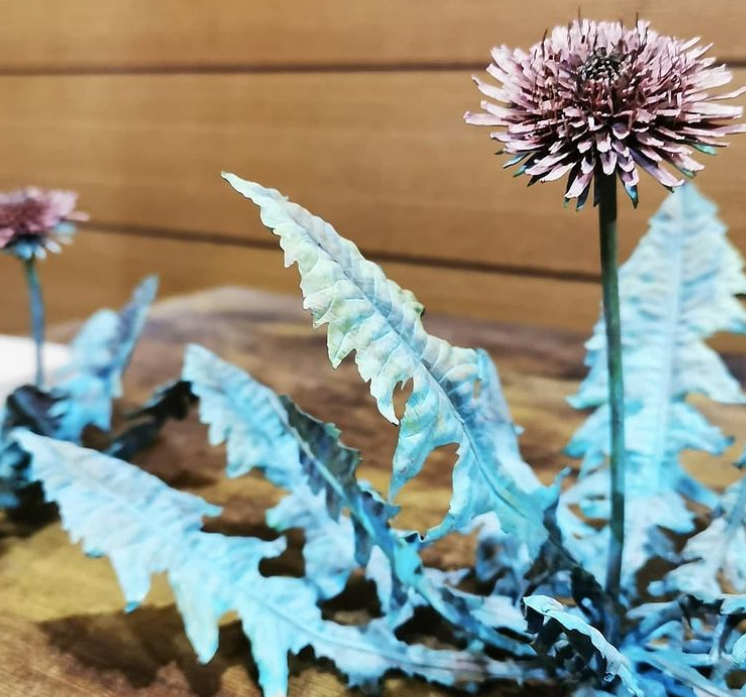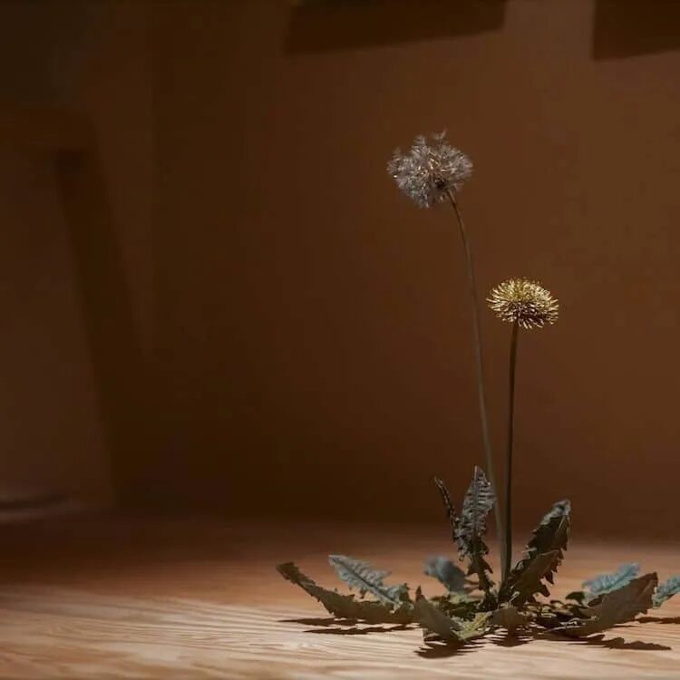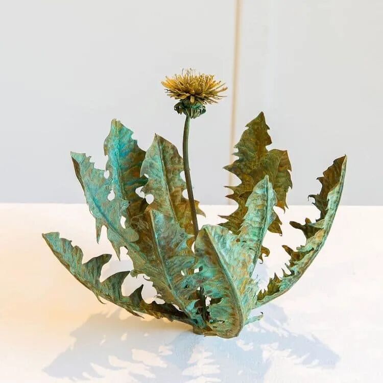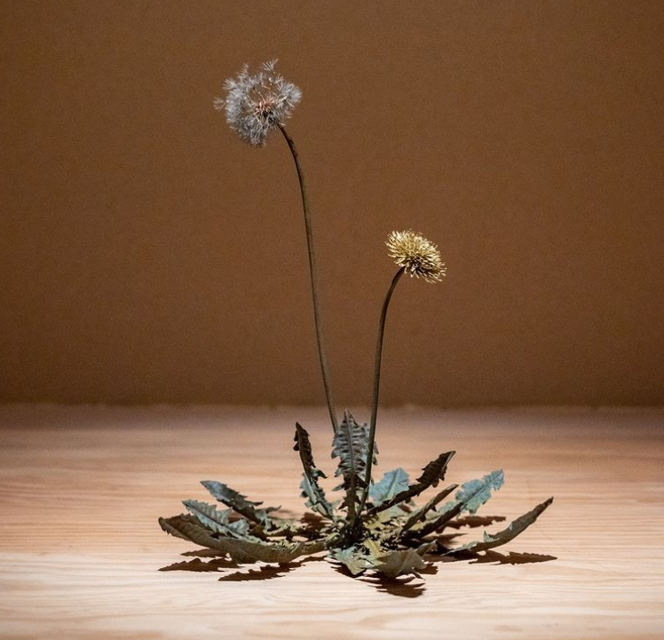 在造型完成之后,作品还要经过上色的步骤,铃木祥太通过生锈、硫化或者氧化等过程为这些金属雕塑上色,最终呈现出逼真且自然的状态。除了蒲公英之外,这位艺术家还用金属创作了其他的植物以及花卉等等。