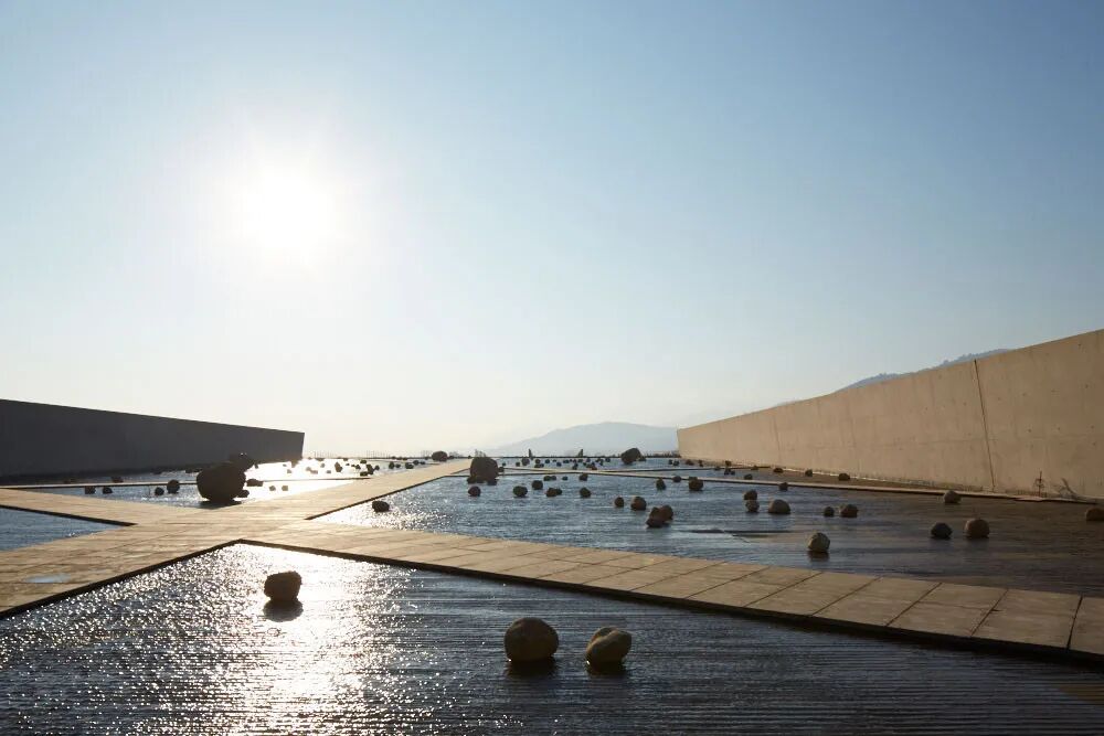 游客沿着一层流动的水进入建筑,一系列的路径围绕着由当地收集的花岗岩建造的设施。水在游客脚下流动,冷却酒窖。墙与墙之间的空间一端朝向山脉,另一端朝向生产工厂。