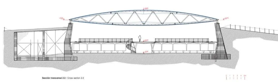 这座280米长的建筑部分被埋在一片田野的中央。其周边环境的美化操作对行人来说是很明显的。