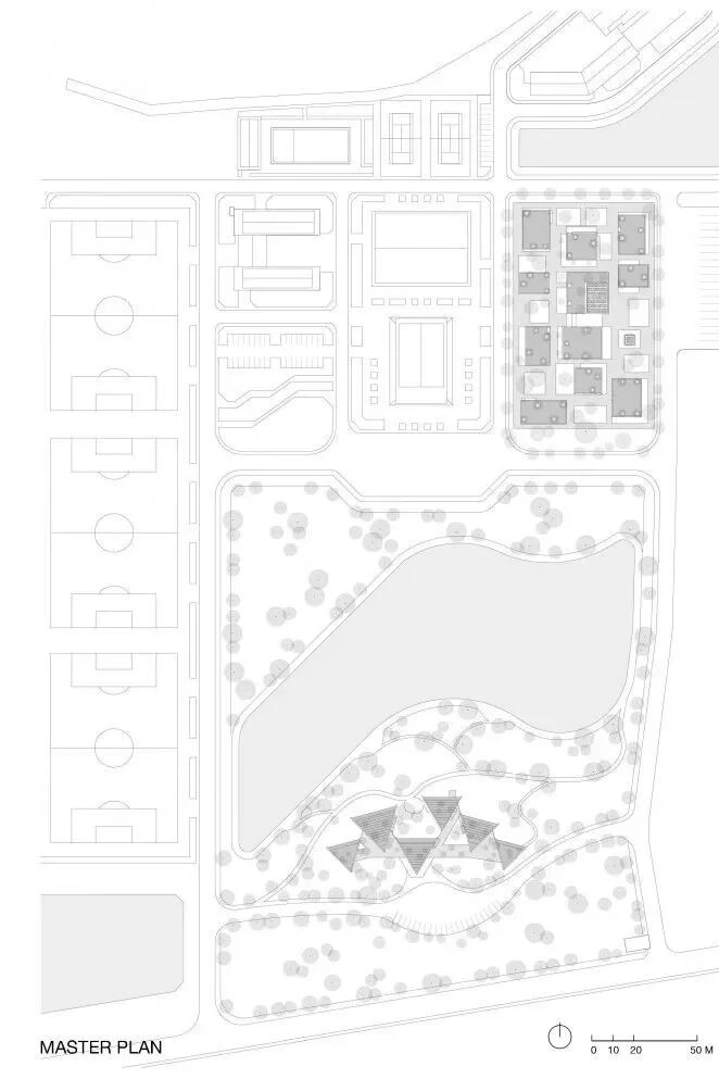它周围环绕着美丽的景观和湖泊,还有郁郁葱葱的绿色空间,因此,这里形成了一个凉爽的微气候环境,而教育中心位于其中的中心位置,这也很方便地从居住区和其他场地进入其中。