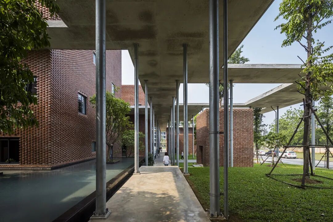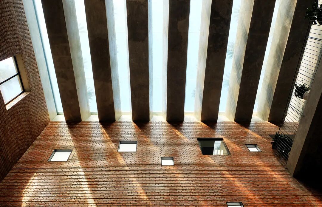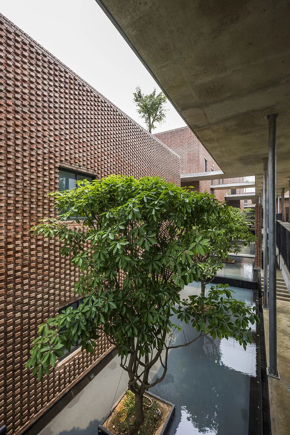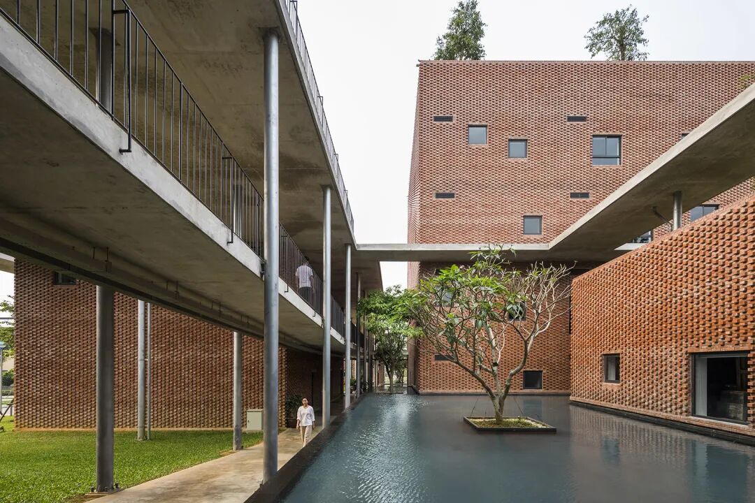 由于河内潮湿的热带气候,建筑师设计了一个轻质混凝土屋顶遮盖住大部分半室外的空间,减少了阳光直接的辐射。