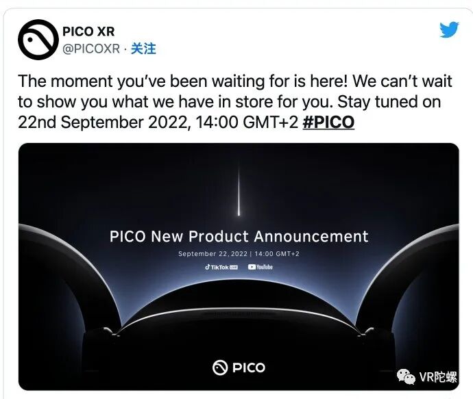 9 月 15 日晚间时间,PICO XR 在海外社交平台发布推文表示 PICO 4 系列新品将于 2022 年 9 月 22 日 14:00 GMT+2 正式发布,届时将在 Tik Tok 和 Youtube 上进行直播。