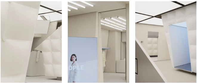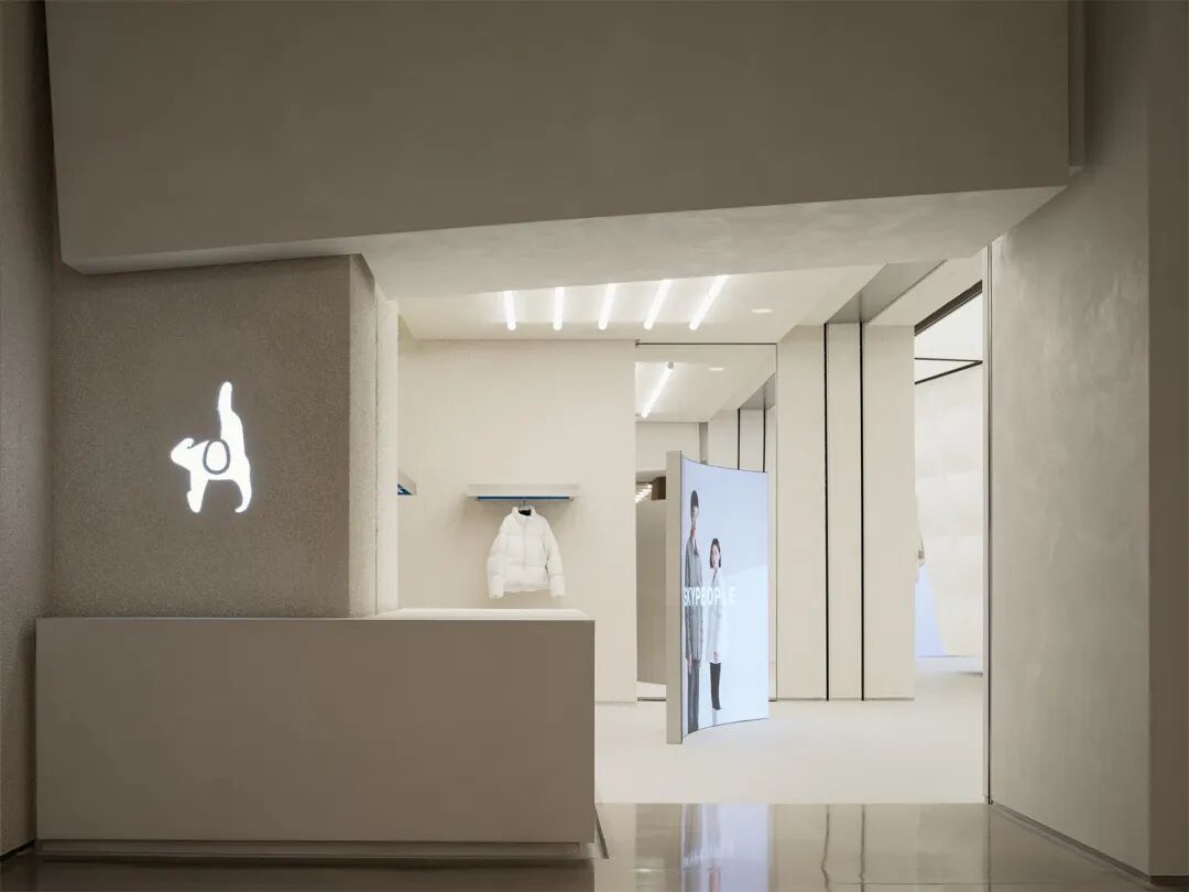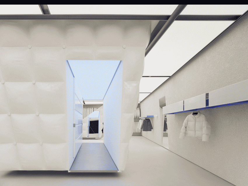 试衣间内部,蓝紫渐变灯光反衬出羽绒的温度,雾化的色彩从走廊入口漫延而出,在一片亮白中氤氲开来,将空间逐渐激活的同时营造出一种与“太空”、“极地”相关的科技感氛围。