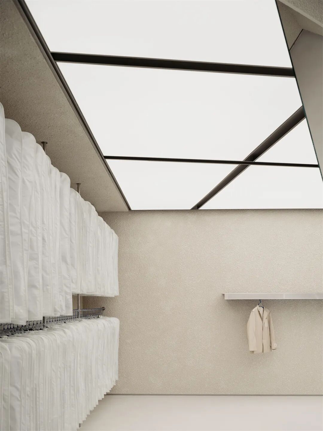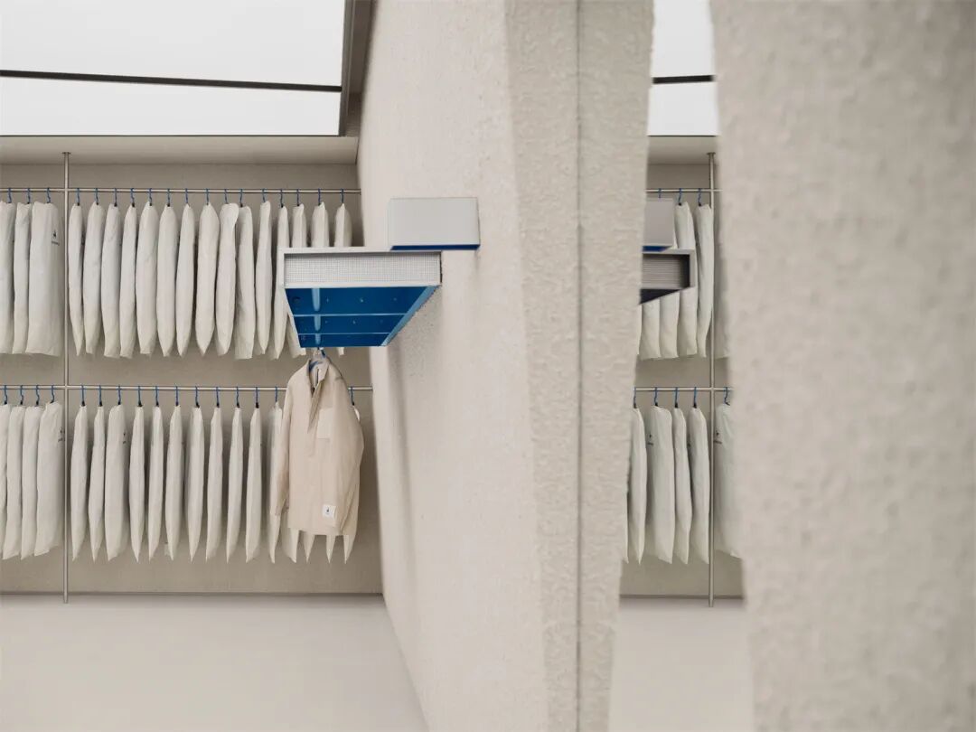 回廊式浏览动线环绕试衣间展开,营造一种“游园”体验;形式不一的金属质展陈道具以空间利用最大化和轻盈美观为原则,或是嵌入墙体或是用绳索悬吊在天花板上;店内并未设有传统仓库和收银台,而是采用更加透明的仓储式展陈,将库存收纳在防尘袋内于店铺后端展出,缓解库存压力、节省空间的同时,让选购过程更加自主、快捷、流畅而具有互动乐趣。