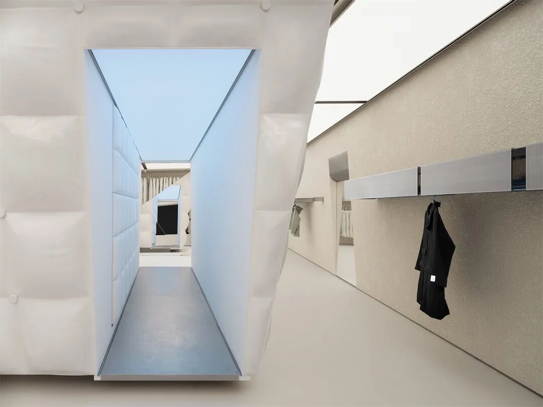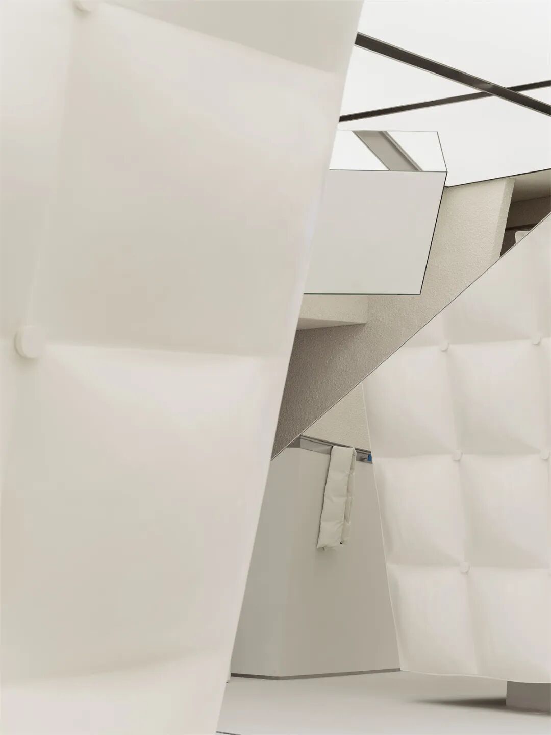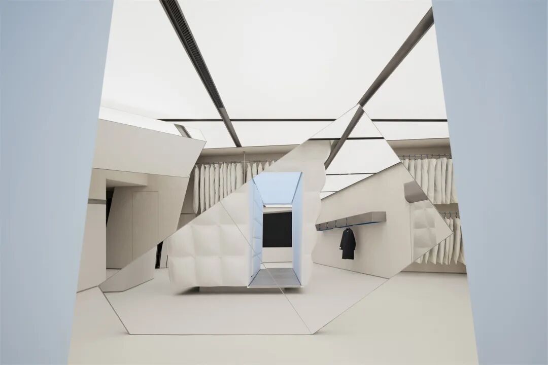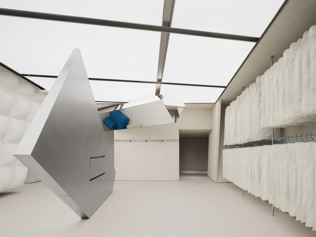 利用材料可塑性并仿照羽绒服表面的填充缝合轮廓,我们为结构打造了视觉上柔软蓬松、应用中耐久易清洁的外部肌理,呼应品牌对服装面料质地和实用性的双重考量。结合空间中的“镜面碎片”,这一结构也可以被视作摩天大楼的抽象变体,将城市中拔地而起的冰冷的高大建筑柔化成“从天而降”的轻盈温暖的漂浮形象。