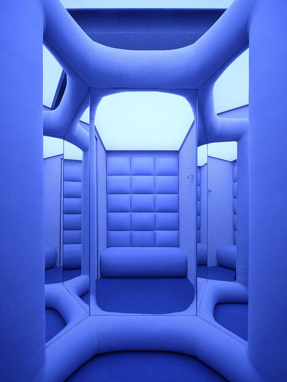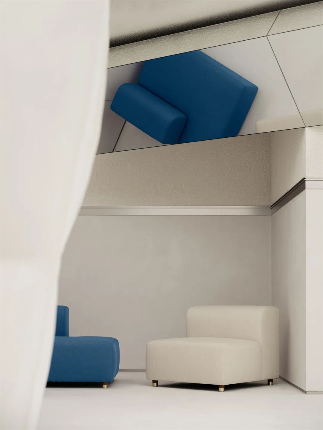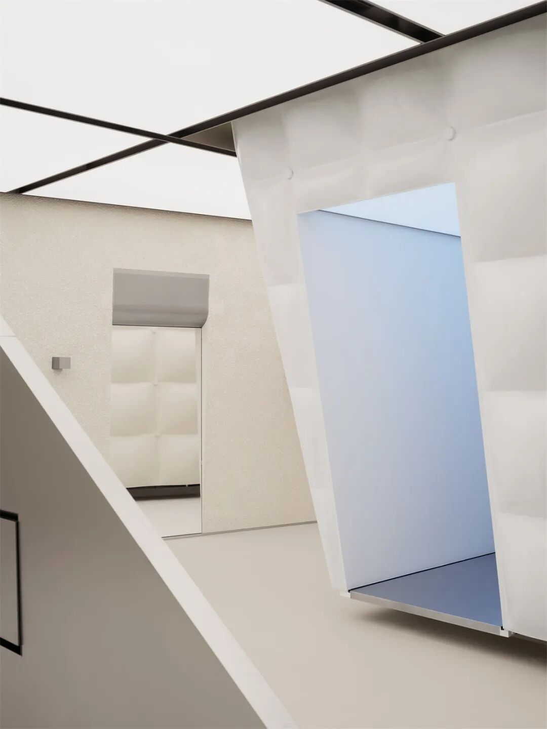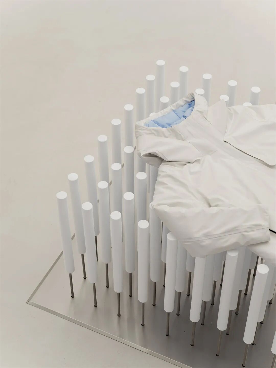 利用材料可塑性并仿照羽绒服表面的填充缝合轮廓,我们为结构打造了视觉上柔软蓬松、应用中耐久易清洁的外部肌理,呼应品牌对服装面料质地和实用性的双重考量。结合空间中的“镜面碎片”,这一结构也可以被视作摩天大楼的抽象变体,将城市中拔地而起的冰冷的高大建筑柔化成“从天而降”的轻盈温暖的漂浮形象。