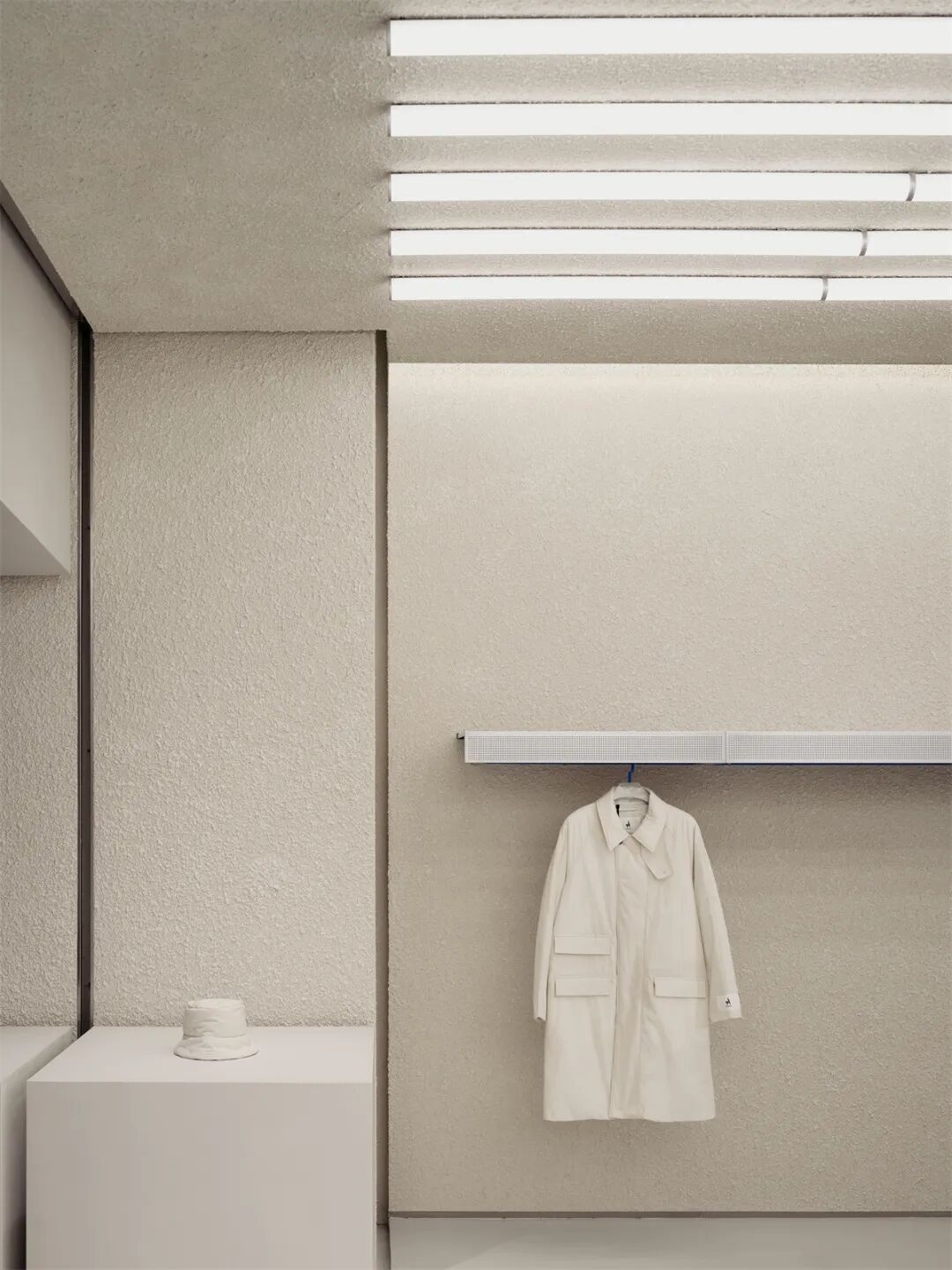 为避免光斑破坏空间立面的平整性和粗粝感,我们大面积使用软膜灯光,根据场地线条特征排布灯光分割方式,并穿插使用灯管,均衡空间整体灯光照度。这种灯光策略让整个场地看似被日光漂白过的雪地,通透明亮而趋近隐形。