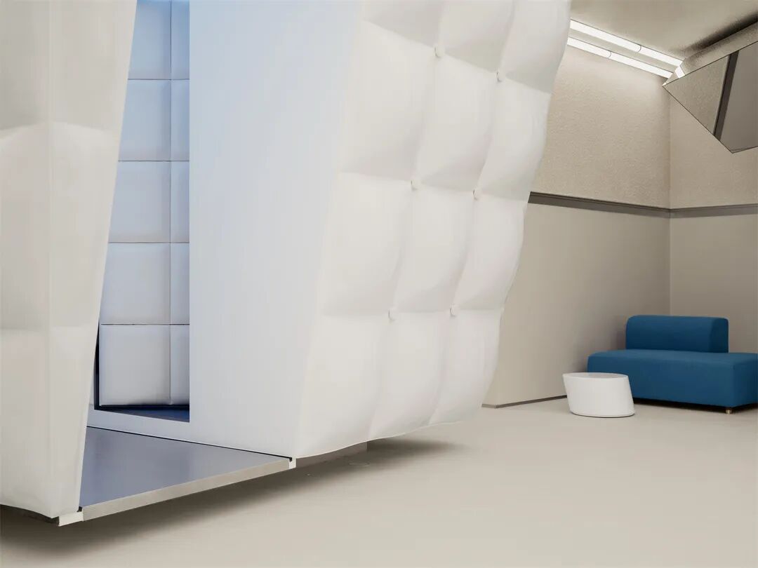 令人联想到降落在钢筋水泥森林中的“天外来物”,作为空间的视觉焦点,结构自身具有一种稳重冷静的气场,正切合产品“低噪响”的特征,另一层面,象征了城市里那些允许人们藏匿和安置情绪的私密环境。