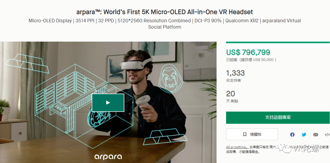 arpara 这次的表现在业内可谓刷足了存在感,超过了早前由法国初创企业  Lynx 发布的号称全球首款 MR 头显的 Lynx R-1 MR( 70 万美金),并在包含 HalfDive 等同期众筹的海外明星 VR 产品中,拿到了 Top 1 的位置。