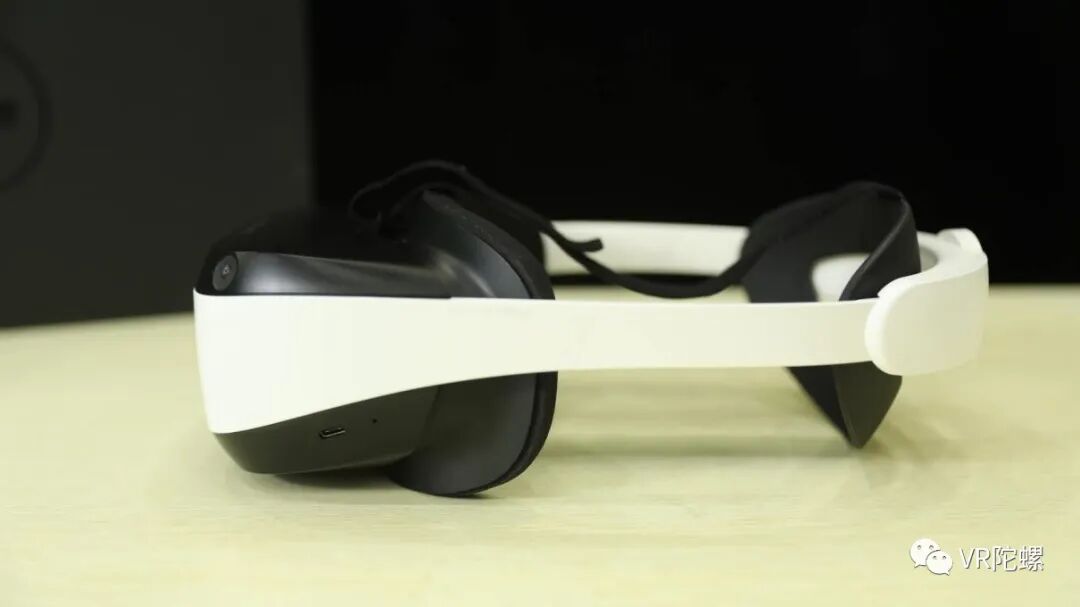 从外观设计来看,黑白色调搭配非常简洁;环形固定头戴以及旋钮调节,方便头显佩戴;电池后置有效减轻头显对面部的压迫,但整体 595g 的重量依旧在同类产品中偏重。