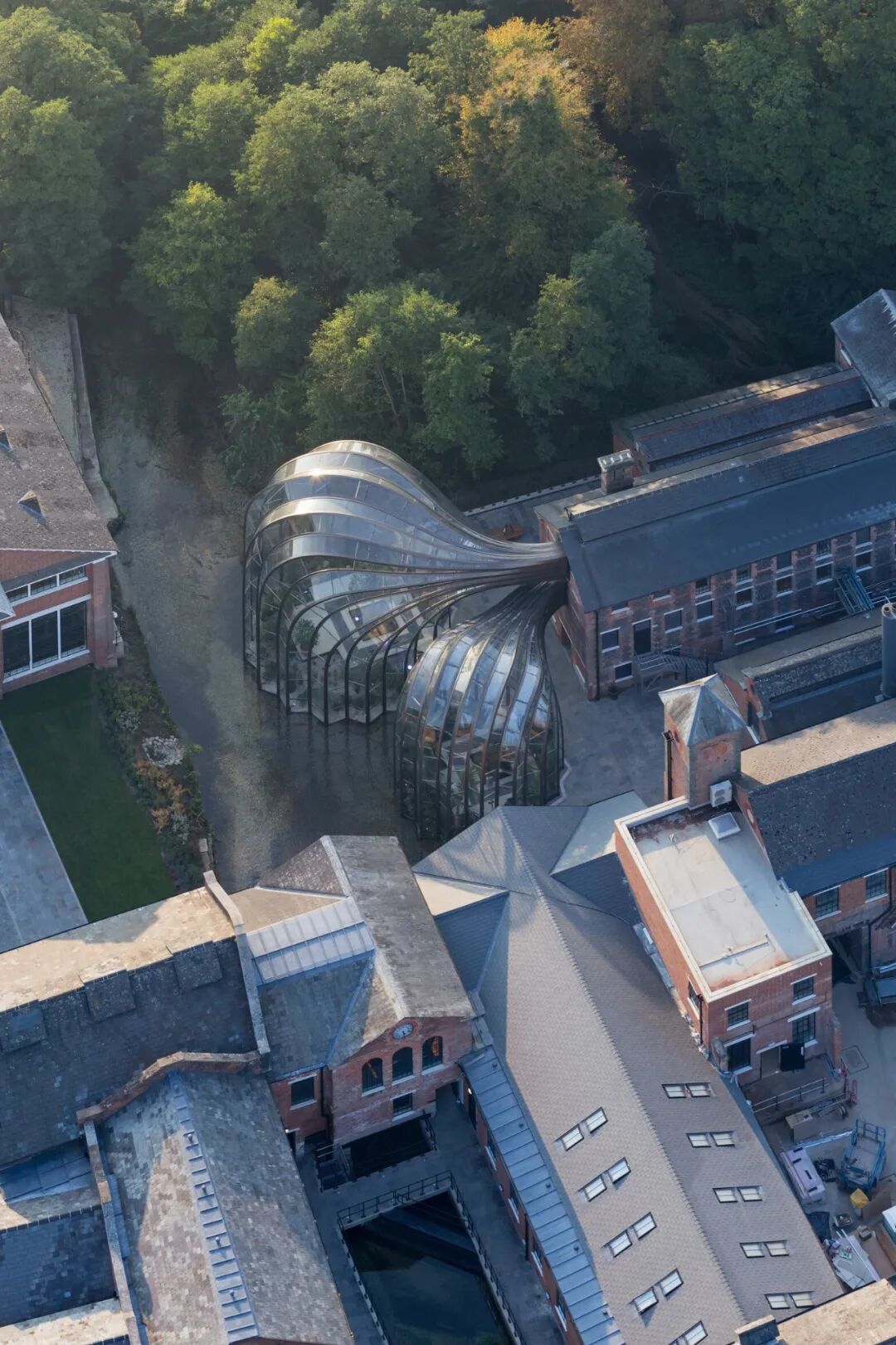 Heatherwick从金酒独特的酿造工艺流程汲取灵感,重新设计规划了在Laverstoke Mill的酒厂。改造不仅将厂区内原有的河道扩宽,更别出心裁地在红砖青瓦中加入了两座晶莹剔透的温室,造型如清冽的金酒从宝蓝色瓶中缓缓倒出,瞬间将酒厂的历史厚重与现代感巧妙融合。
