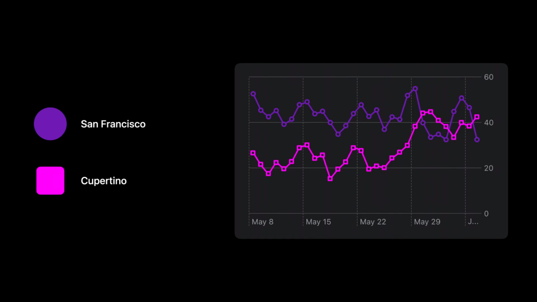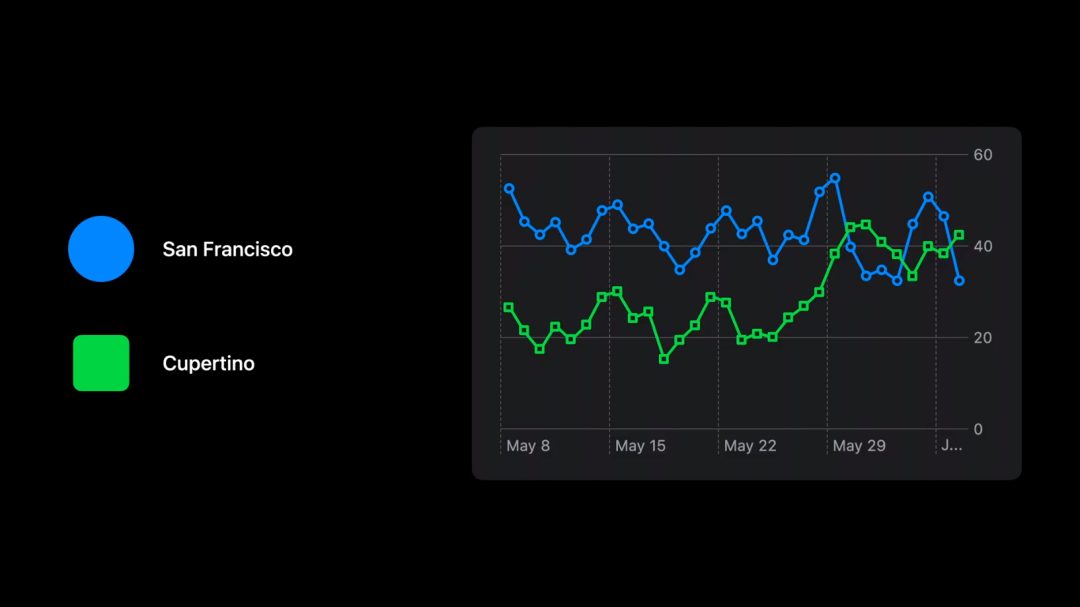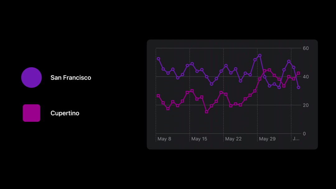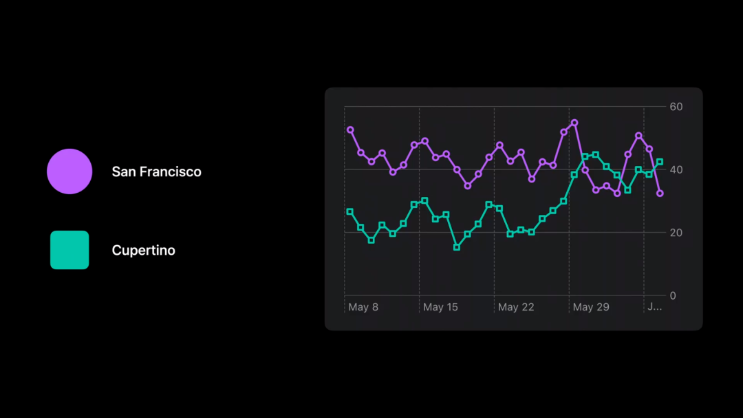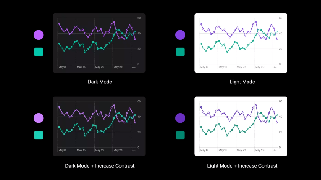 然而,图表的背景色可能会随着系统而变化,为了让图表在深色和浅色模式都好看,你可能要提供不止一套颜色: