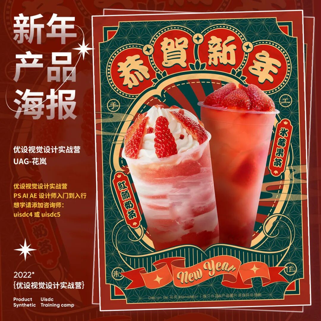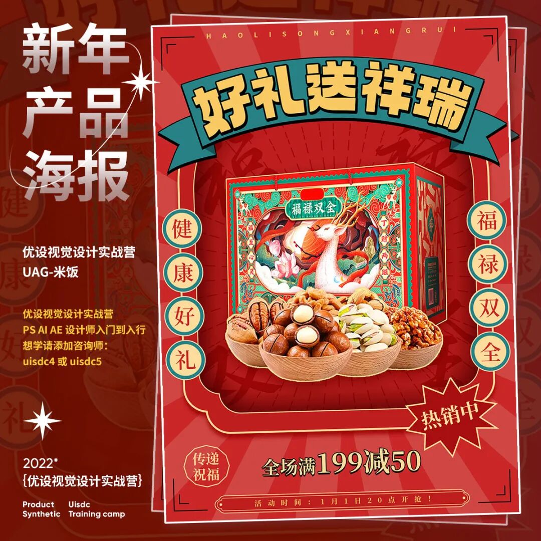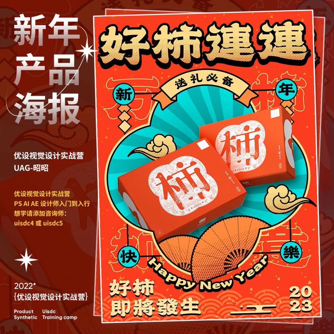 新年产品海报怎样设计?快过年了,电商平台的年货节已经开始了,最近打开网页都是铺天盖地的年货海报,满满的新年氛围!今天就给大家分享9组2023新年产品海报创意设计思路,产品海报首要是突出产品,画面中的占比不要太小,也不能被装饰元素抢了风头。其次是设计氛围,配色红艳和国风元素,能烘托出喜庆氛围。往期视觉营学生的「新年产品海报」作业希望能给你些灵感。