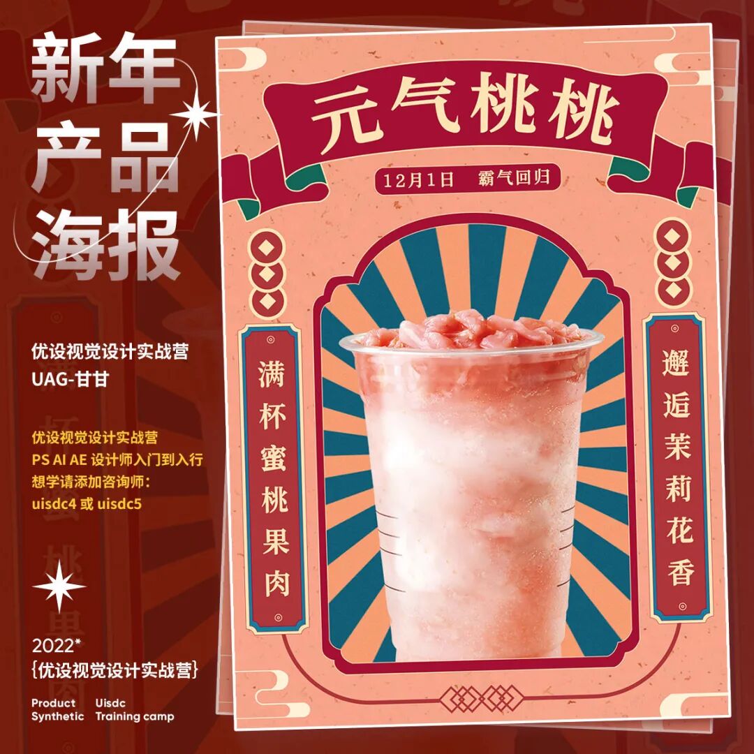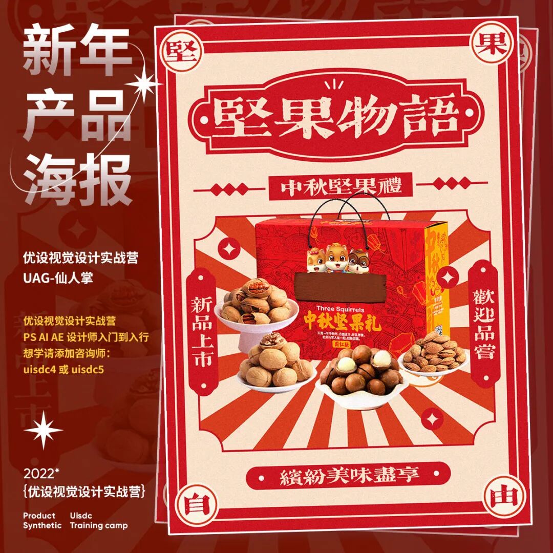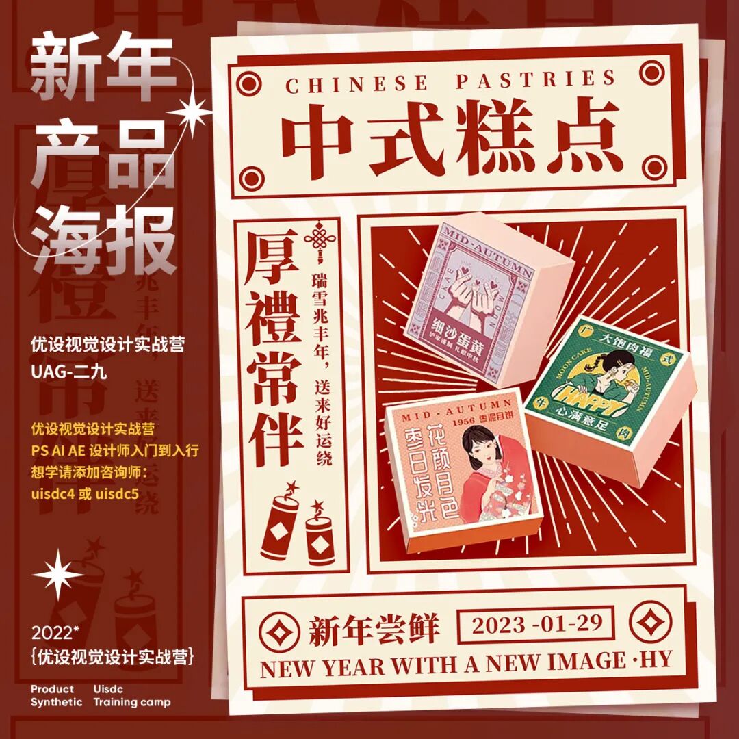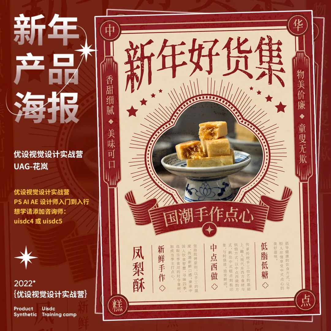 新年产品海报怎样设计?快过年了,电商平台的年货节已经开始了,最近打开网页都是铺天盖地的年货海报,满满的新年氛围!今天就给大家分享9组2023新年产品海报创意设计思路,产品海报首要是突出产品,画面中的占比不要太小,也不能被装饰元素抢了风头。其次是设计氛围,配色红艳和国风元素,能烘托出喜庆氛围。往期视觉营学生的「新年产品海报」作业希望能给你些灵感。