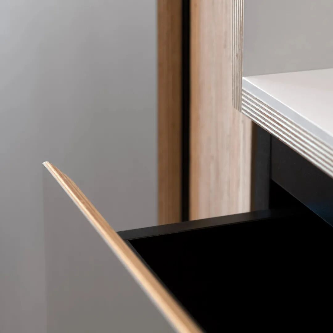 天花与地板均用了木材,天花的木材呈条纹略浅的颜色,以示上下区分。浅暖木色、浅米灰色、白色搭配为主调,黑色为次色,整体温暖理性。一体式橱柜代替了一整面墙,盥洗台、烤箱、蒸箱、操作台一应俱全,并做了很多收纳分隔。