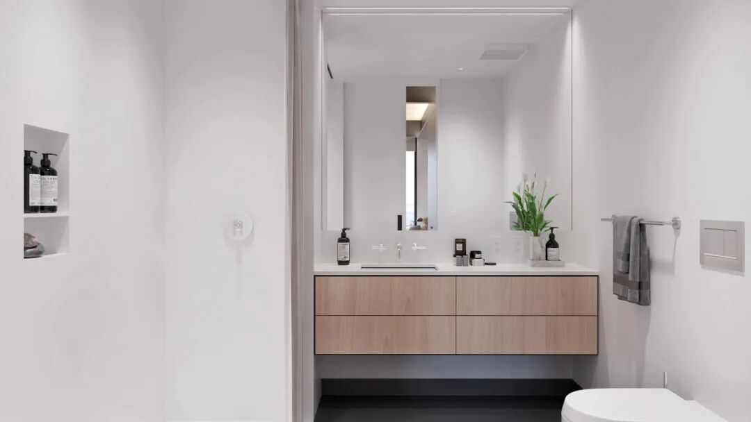 如果在较为宽敞的起居室不明显,那么在卧室中比较明显的一点是层高,它比普通住宅要高一些,这是项目的特点之一,天花板高且无穿透,以实现更好的隔音效果,可调节的照明系统藏在其中。在 Siegel 看来,充足的日光、新鲜空气、自然材料、较高层高的空间以及被郁郁葱葱的绿色植物覆盖的外墙是高质量公寓楼必不可少的条件。