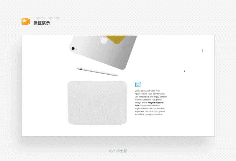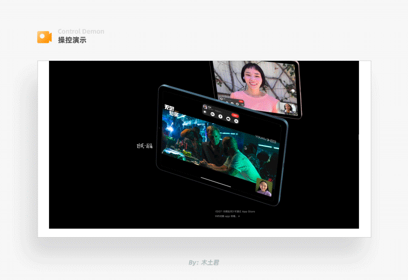 iPad从手上滑落,随着页面往下,ipad被另一只手轻松接住,苹果用这种视觉冲击方式将上下文巧妙衔接,让用户在产品跌落瞬间内心一惊的同时惊呼产品好小好轻。
