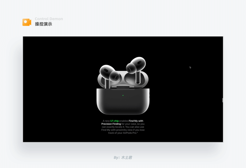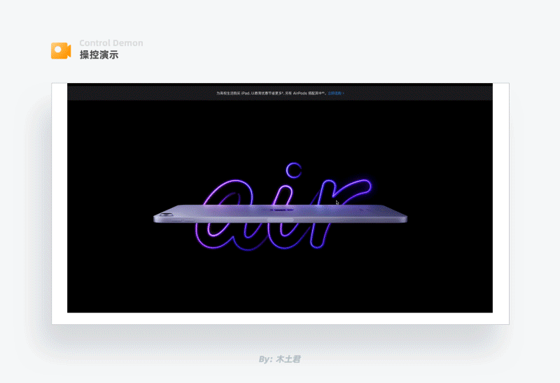 因为是Air系列,核心还是轻盈,我们看看苹果是如何做的。随着页面往下,搭配不同使用场景界面的不同角度产品会以三维立体的方式运动,来配合文案的展示,对于消费者来讲,这种形式就像是在看一场舞蹈表演,会忍不住多看几眼里面的内容。
