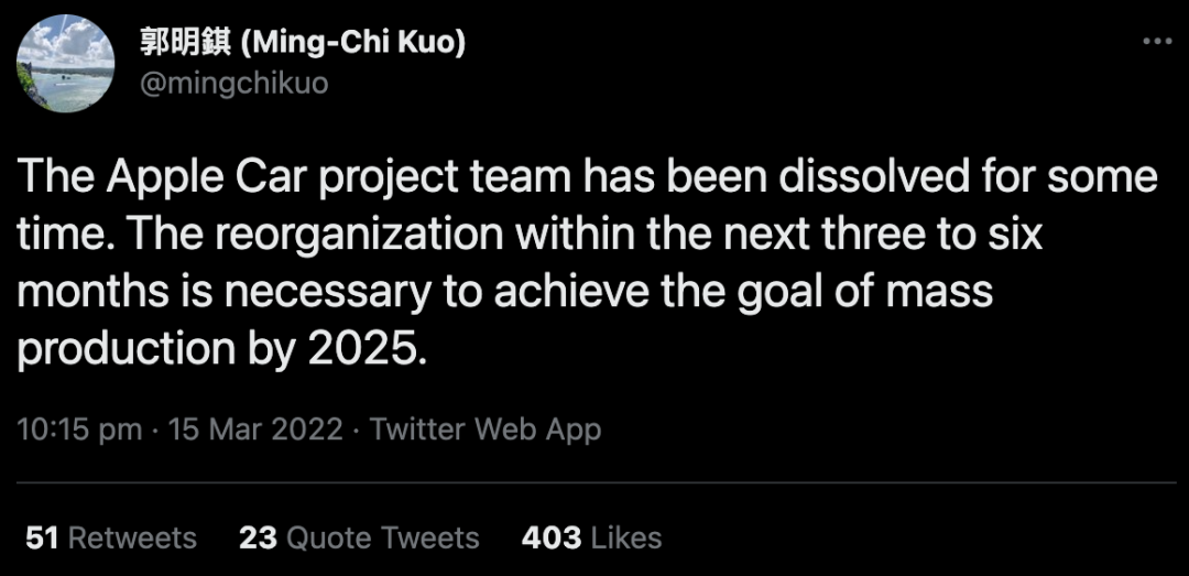 https://appleinsider.com/articles/22/03/15/apple-car-team-dissolved-2025-launch-may-be-in-doubt-says-ming-chi-kuo
