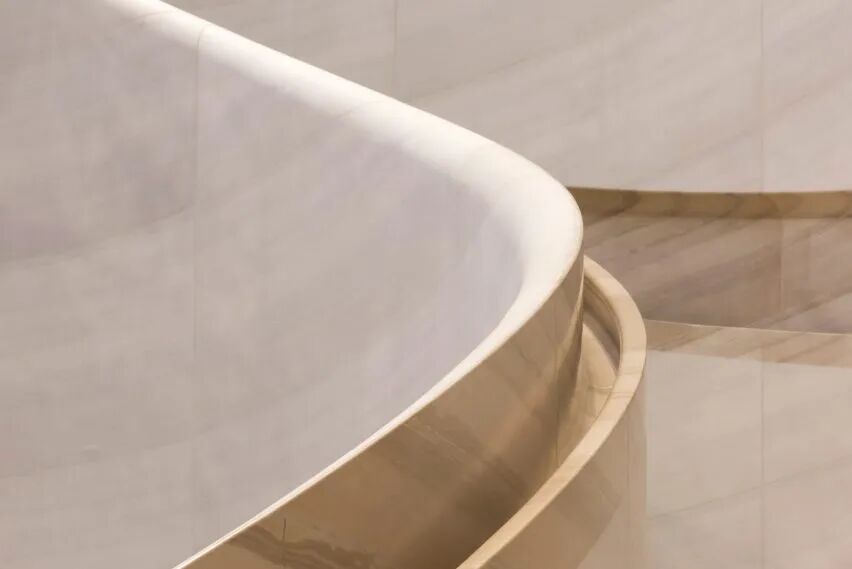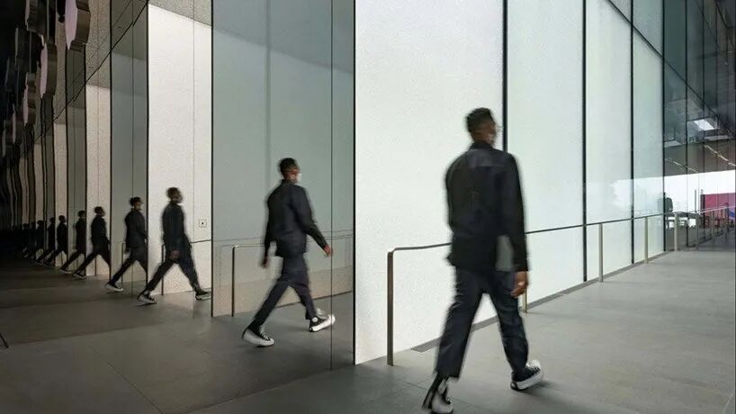 顾客可以沿着两侧亲水坡道进入店内,近距离地观赏环绕于四周的层叠流水台阶。从另一侧入口大门通过时,还能享受从外部玻璃上倾泻而下的水流景象与声音。