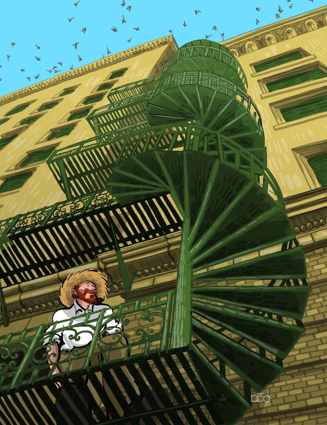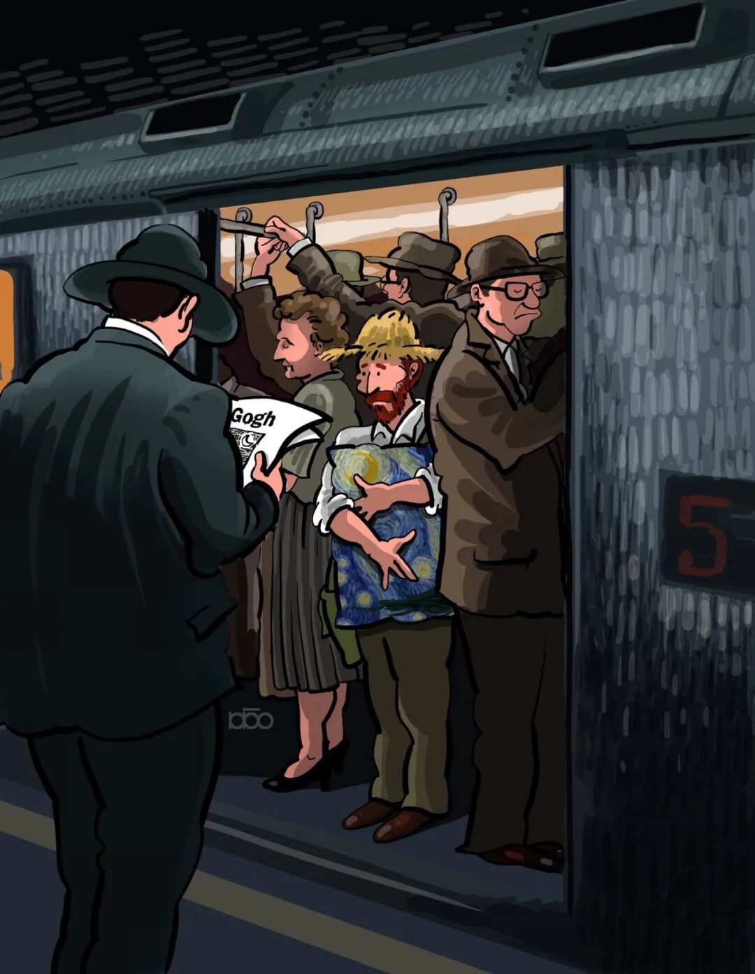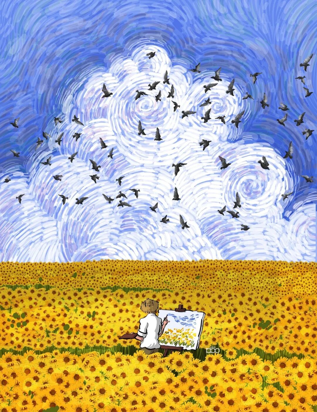 小绛将这些插画作品,按照故事的时间线串联起来,平行时空的梵高绘画、交朋友、进入大城市,一直到功成名就,这些场景与梵高悲惨的一生相比,形成强烈反差,让人感叹,如果画中的一切都是真的那该有多好,接下来,就让我们欣赏一下这位插画家的最新作品,一起来看看生活在平行时空的梵高都在做些什么吧。