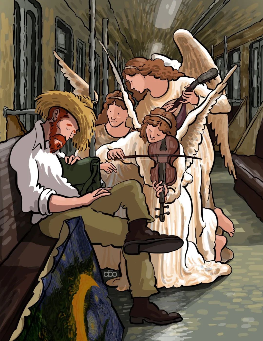 小绛不知道未来会不会有时空旅行机器,但是,插画家可以利用自己的想象力,将梵高的故事延续下去,这位以梵高的经历为题材的插画家阿利雷扎·卡里米·莫哈达姆,还在继续他的插画作品。在他的故事里,梵高不仅来到了现代世界,还跟弗里达·卡罗成为了好朋友,在插画家为梵高创作的新世界里,他在快乐地绘画,就像梵高曾经说过的那句话:“我想用我的艺术来触摸人们。 我希望他们说:“感觉很深,它很温柔” 。