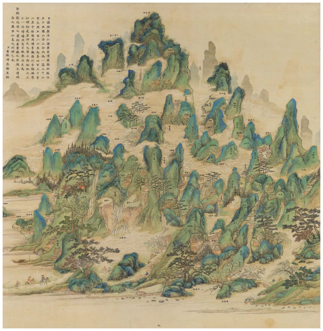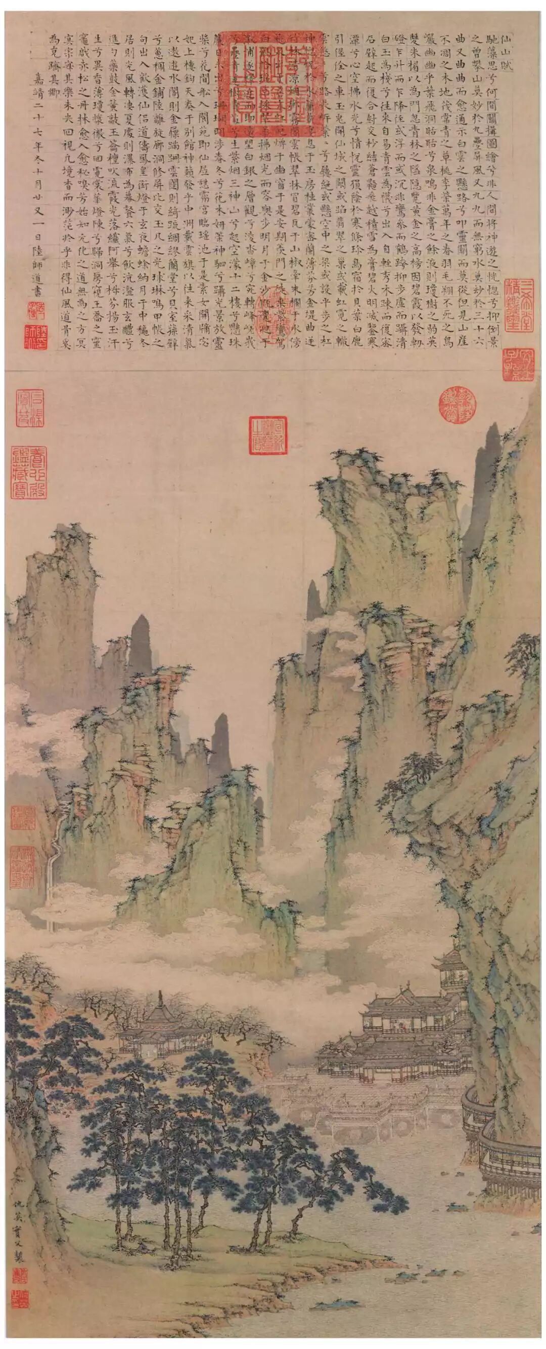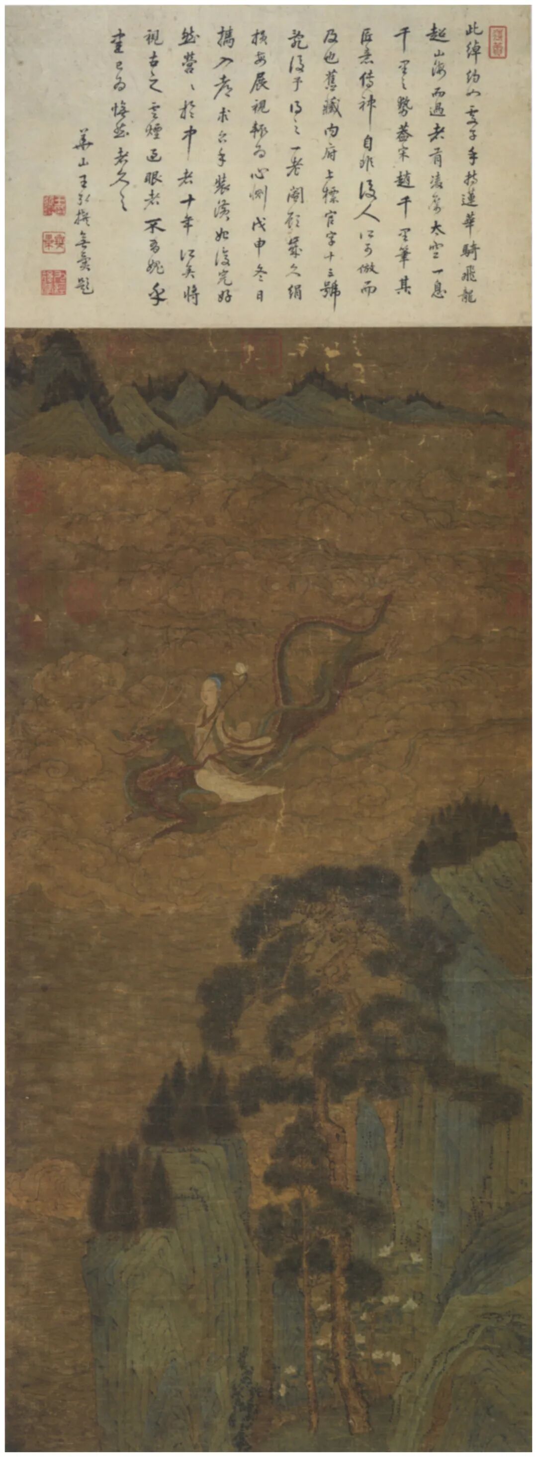 吴派画家文伯仁(1502-1575)此作,以青绿设色画「方壶」浮起於波涛万顷间。三角形山峰峥嵘,中有宫观平台和常青树林,白云缭绕其间,并往上聚合窜升,颇能呼应《史记》描述三神山远望如云,人靠近时反而居于水下,最后被风引去的神秘性质。画幅上、下款加框榜题,是仿自早期释道画的做法。