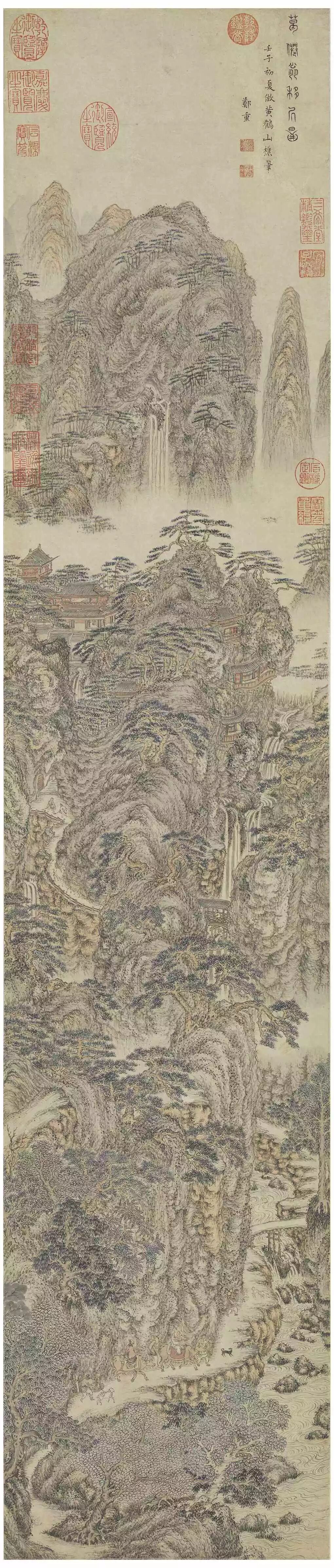 据画家题识,图名《神岳琼林》。琼林指龙虎山琼林台,神岳语出自南朝梁陶弘景(456-536)《真诰》,足见画家意在呈显宗教性的道教圣山。前景画林木葱郁,内狭外敞的水口向内深入。中景竹林房舍隐见,左方一隐士策杖登台,对照巨大的山峰拔地而起,更显渺小。山石以湿笔刷、点、染,笔法率性,直觉地表现出圣山的生气与超凡。